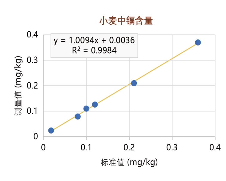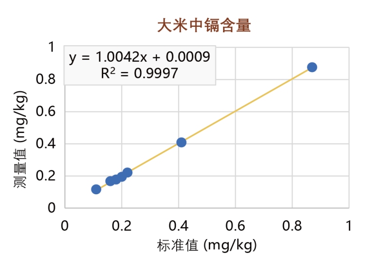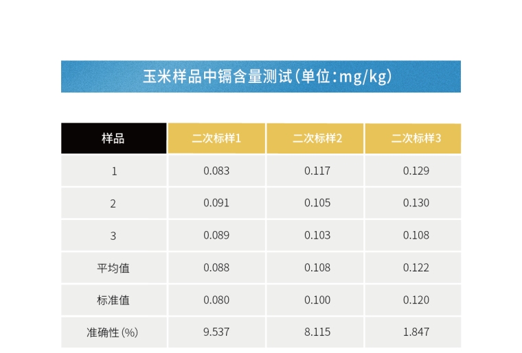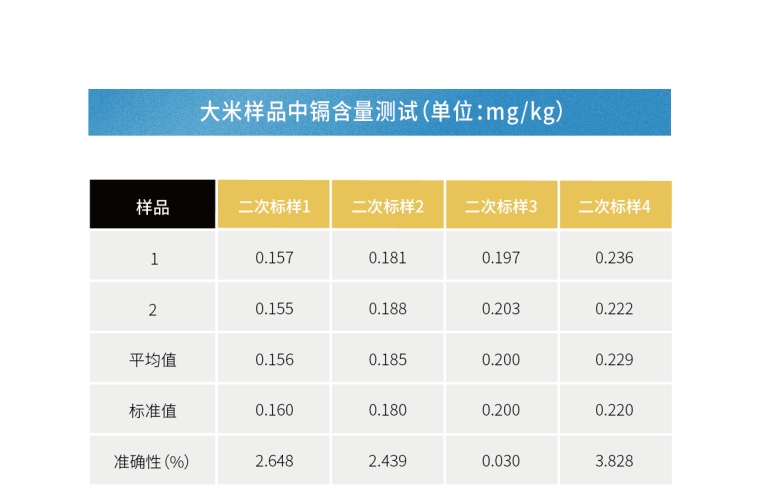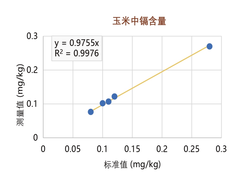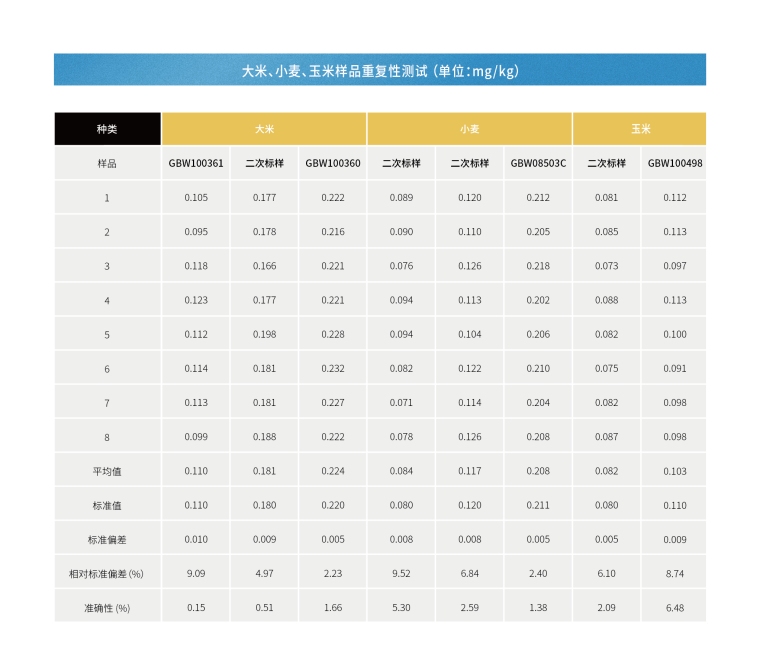 选取一定数量大米、小麦和玉米标准样品, 对其中的镉元素进行直接分析,通过分析其测量值与标准值的相对误差来考察仪器的测试准确性。下图数据表明XR700产品对三种样品中的低含量镉进行检测均可提供精确、稳定的结果,0.2 mg/kg和0.1 mg/kg样品的分析误差通常小于10%。