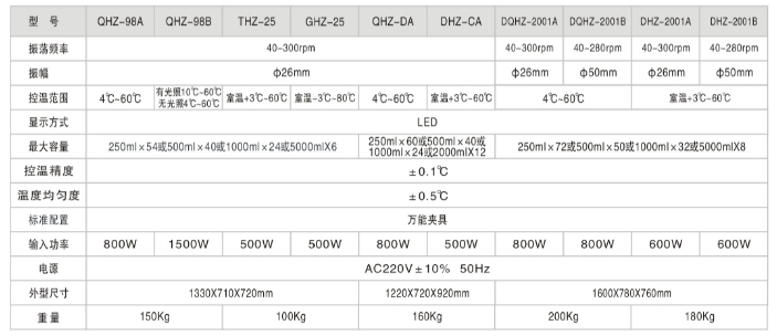 QHZ系列恒温,全温振荡培养箱,是旋转型空气恒温振荡培养箱,其结构为落地卧式。其中全温型设备采用优质镜面不锈钢内胆,防污,易清洗。箱体内部有冷热气流风道,使箱体内气流循环流畅,加上温度控制采用先进的微电子调控系统,提高了温控精度。速度控制采用特种电机,使振荡频率稳定可靠。LED显示直观,醒目,操作使用十分方便。 性能与特点 1、集恒温培养箱与振荡器于一体,既可静态培养、也可作动态培养,一机二用。 2、驱动机构为三维一体的偏三轮,具有旋转平稳、坚固耐用,尤其是截重性能好,对振荡板上的培养体放置无需平均。 3、电器控制部分为电脑芯片和触摸式操作,温度与振荡由二块芯片分别控制。 4、采用LED的数字显示振荡频率和温度,使得操作清楚、观察时一目了然。 5、控温采用PID温度补偿功能,减少了箱内的温度过冲和不必要的波动。 6、驱动电机采用特种的交流感应无刷电机,使用后故障少、寿命长,免保养。 7、致冷采用进口机组,噪音低、致冷效果好。 8、设有定时功能:o-999分范围内可任意设定培养时间。 9、外型美观,大型可视窗并装有照明灯,静电喷塑箱体。 特别介绍 QHZ-98B全温度光照振荡培养箱,可全天候模拟自然状态,采用新光源,光照强度大于10000LX,并根据要求任意可调,可编程时控器,可设定每天相同。星期一至星期五相同。星期六与星期日相同,或设定每天不同的光照时间。 GHZ-25是高温恒温大容量振荡培养箱,采用特种高温风机,高效的保温措施,突破了普通空气浴恒温振荡培养箱难以达到的80℃高温,使用领域和范围大大拓展。 2001B型为大振幅振荡培养箱,振幅为中50mm。可满足大通气量生物培养的特别需要。 技术指标