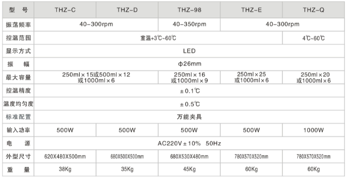 THZ系列台式恒温振荡器,均为台式。其中THZ-Q台式空气恒温振荡器是有冷热系统联合调节的恒温振荡培养箱。THZ系列恒温振荡培养箱,外形小巧,美观大方,占用空间小,特别适用多品种小批量的实验需要。 性能与特点 1、集恒温培养箱与振荡器于一体,既可静态培养、也可作动态培养,一机二用。 2、驱动机构为三维一体的偏三轮,具有旋转平稳、坚固耐用,尤其是截重性能好,对振荡板上的培养体放置无需平均。 3、电器控制部分为电脑芯片和触摸式操作,温度与振荡由二块芯片分别控制。 4、采用LED的数字显示振荡频率和温度,使得操作清楚、观察时一目了然。 5、控温采用PID温度补偿功能,减少了箱内的温度过冲和不必要的波动。 6、驱动电机采用特种的交流感应无刷电机,使用后故障少、寿命长。 7、设有定时功能:0-999分范围内可任意设定培养时间。 8、外型美观,大型可视窗并装有照明灯。 技术指标