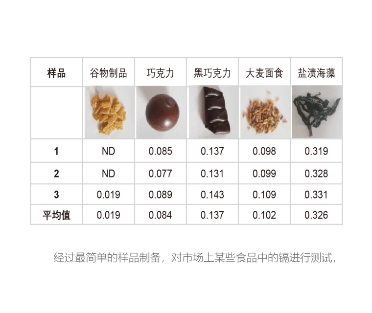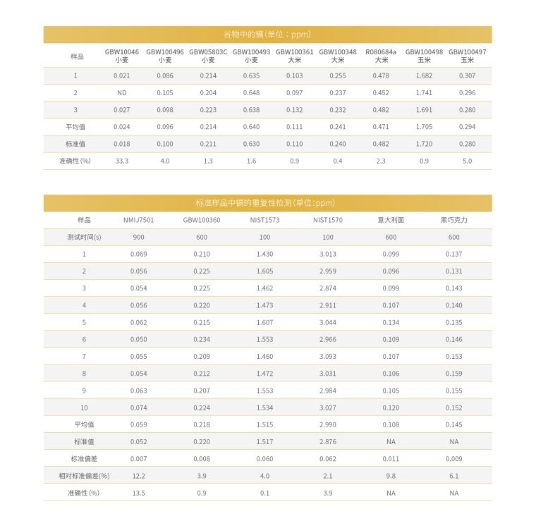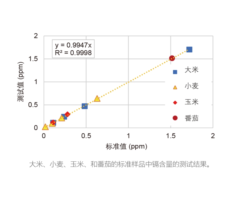 JP500对各类谷物进行检测以及对农作物及食品标准物质中的镉进行多次重复测量结果,测试结果具有很高的准确性和重复性和验证方法的稳定性。