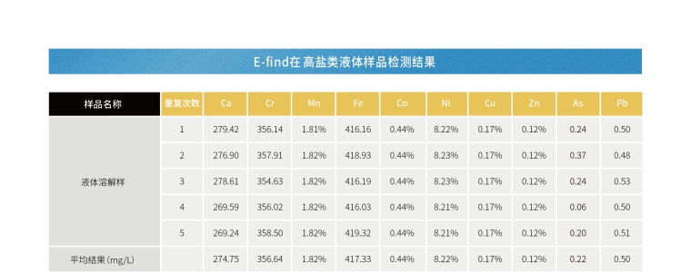 ·E-find仪器可以针对各种类型的矿物及矿物中多种元素进⾏⾼精度分析,可⾼效快速进⾏原料或矿样品质评价。 ·对各种类型的矿物通过基本参数法对基体进⾏校正,且只需简单制样就可以得到⾼精度的测试结果,与实验室测试结果⾼度⼀致。 ·快速分析矿物中铁、钙、铜、锰等⾦属元素和磷、硫、硅等⾮⾦属元素含量。 ·针对材料中微量元素、主量元素进⾏准确定量分析;应⽤于不同形态的硫酸钴、硫酸锰、硫酸镍等样品分析,如液体、固体、粉末等。 产品特点·采⽤独⽴⻛道散热⽅式,避免⻓时间的⼯作,导致元件温度升⾼ 进⽽导致数据偏差,先进的单波⻓激发技术及软件算法,⼤幅提⾼检测精度、减少测试误差。 ·进样与采样简单化,进样量少,简化现场制样流程,体积⼩,⽅便室外⼯作,随时随地进⾏现场分析。 ·采⽤嵌⼊式系统,⾼分辨率液晶显⽰触摸屏,结合数字多道技术。 ·强⼤的数据存储能⼒,能够连续存储⾄少10000次检测记录。 ·有效提升数据传输和运算能⼒;数据导出专业、全⾯、可进⾏Excel编辑。 ·⽀持蓝⽛打印功能并⽀持4G、5G远程数据传输。 应用实例 E-find系列仪器可以对新能源中的材料进行高精度分析。如三元锂电池中,可以应用于生产中控环节中原材料高冰镍萃取液、循环水废渣、废液前驱体等样品中的微量元素、主量元素进行准确定量分析;下列是E-find在高盐类液体样品重复检测结果,每个样品2次重复检测,每次检测时间为5分钟。