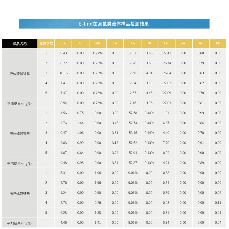 ·E-find仪器可以针对各种类型的矿物及矿物中多种元素进⾏⾼精度分析,可⾼效快速进⾏原料或矿样品质评价。 ·对各种类型的矿物通过基本参数法对基体进⾏校正,且只需简单制样就可以得到⾼精度的测试结果,与实验室测试结果⾼度⼀致。 ·快速分析矿物中铁、钙、铜、锰等⾦属元素和磷、硫、硅等⾮⾦属元素含量。 ·针对材料中微量元素、主量元素进⾏准确定量分析;应⽤于不同形态的硫酸钴、硫酸锰、硫酸镍等样品分析,如液体、固体、粉末等。 产品特点·采⽤独⽴⻛道散热⽅式,避免⻓时间的⼯作,导致元件温度升⾼ 进⽽导致数据偏差,先进的单波⻓激发技术及软件算法,⼤幅提⾼检测精度、减少测试误差。 ·进样与采样简单化,进样量少,简化现场制样流程,体积⼩,⽅便室外⼯作,随时随地进⾏现场分析。 ·采⽤嵌⼊式系统,⾼分辨率液晶显⽰触摸屏,结合数字多道技术。 ·强⼤的数据存储能⼒,能够连续存储⾄少10000次检测记录。 ·有效提升数据传输和运算能⼒;数据导出专业、全⾯、可进⾏Excel编辑。 ·⽀持蓝⽛打印功能并⽀持4G、5G远程数据传输。 应用实例 E-find系列仪器可以对新能源中的材料进行高精度分析。如三元锂电池中,可以应用于生产中控环节中原材料高冰镍萃取液、循环水废渣、废液前驱体等样品中的微量元素、主量元素进行准确定量分析;下列是E-find在高盐类液体样品重复检测结果,每个样品2次重复检测,每次检测时间为5分钟。