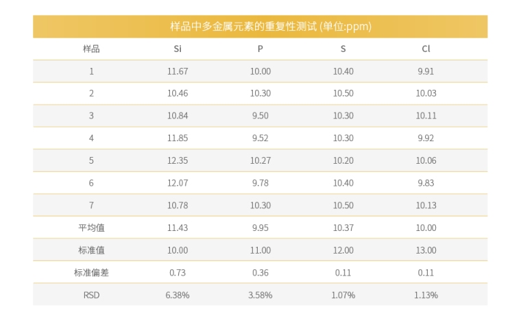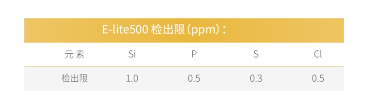 E-lite500 可以快速准确定量分析液体、粉末等样品中的硫、氯、硅、磷等轻元素,在轻基体下检出限可以低至 ppm 级别;针对食品中铝、磷、钾以及工业应用中轻元素有出色的分析性能。