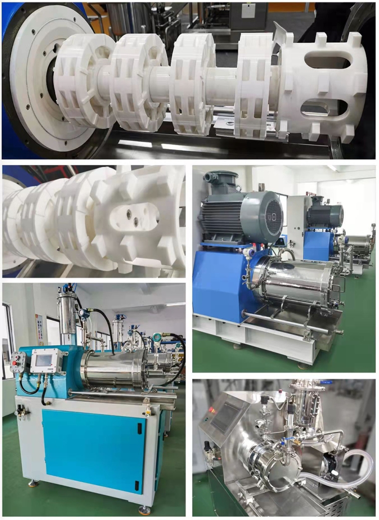产品优势 1.特殊的涡轮优化设计,使研磨腔内磨珠具备更大的动能,同时磨珠分布更均匀,细度分布更窄 2.专利设计的涡轮,在高速旋转过程中产生的径向压力差,会形成极强的涡旋力,使得研磨介质不需接触涡轮,即可获得极高的速度,形成粒子束,动量大,提高了研磨效率 3.涡轮材质可根据具体工况选择,有聚氨酯、精密陶瓷可选,防止金属污染 4.出料方式,灵活可选,根据要求不同,离心大面积筛网分离器保证大流量,小粒径研磨珠,轻松实现纳米研磨,而动态缝隙式分离器则适用固含量高的物料,自清洁强 5.双端面机械密封,配置独立冷却单元,设置传感监控,确保设备安全 6.料温、料压、气压、水压多重保护,保证设备安全和生产现场安全。 7.我司高效涡轮式砂磨机图片,最高速线可达20m/S。