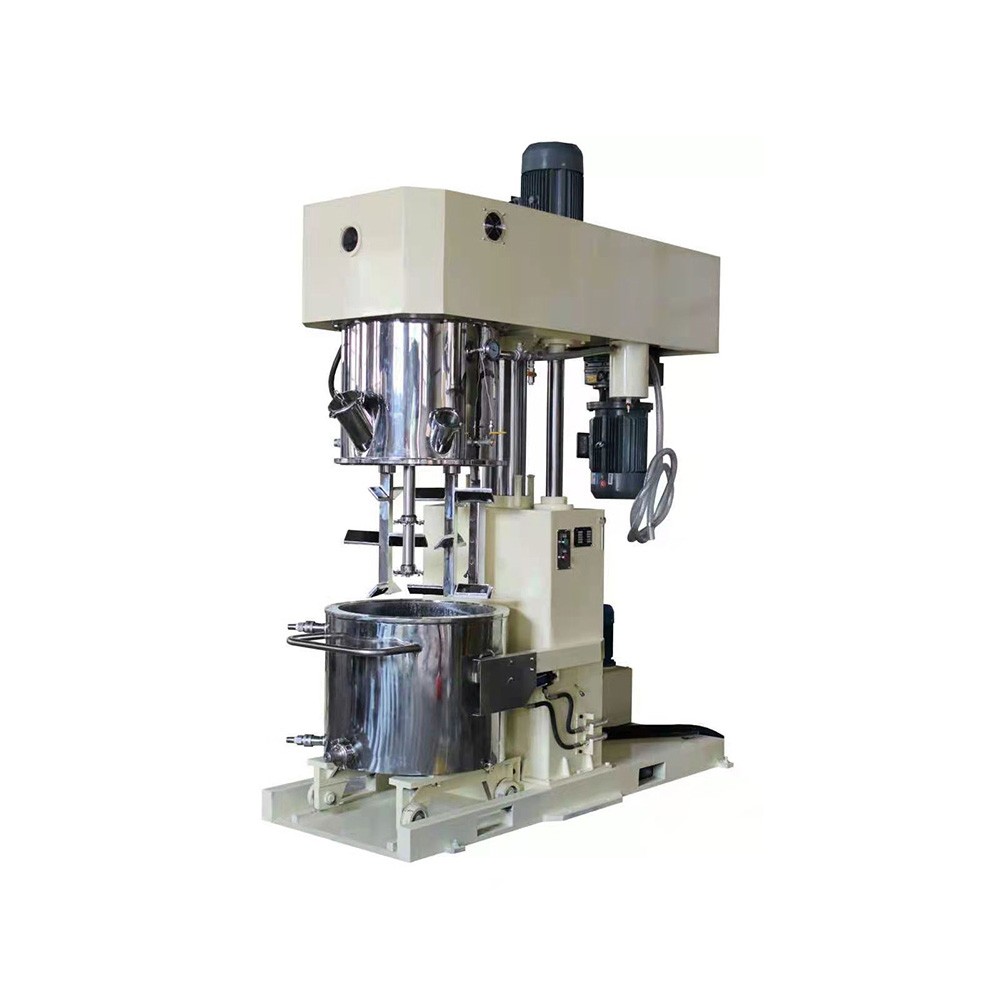 双行星动力搅拌机的传动行星轮,输出扭矩大,是专门针对高粘度、高固含、高温物料的一种高效率、易清洗、易维护的新型搅拌设备。该设备由低速搅拌部分、高速分散、乳化部分、刮壁刮底部分、温控装置等部分组成,具有优异的搅拌、溶解、分散、均质、反应效果。 高速分散装置能有效的防止物料抱团,且很容易将物料粉碎,轻易脱泡。低速搅拌桨在公转时也自转,使物料做上下级四周运动,将物料推到高速区域进行高速剪切,快速达到理想混合效果。所配独立刮刀,可对桶壁/桶底进行刮试,避免死角,确保产品质量。 根据不同工艺状况,搅拌可分为桨叶式、麻花爪、爪式、框式等,可以有单浆、单分散;双桨、单分散;双桨、双分散等不同组合方式。 机械密封设计,可以配合真空系统,实现在真空状态下的搅拌,料缸可设计带夹套加热,配合模温机,可进行恒温分散搅拌功能,充分保证产品质量。 产品优势 1.效率高,两组搅拌和高速分散,公转同时自动,使物料短时间受到强烈剪切、捏合作用,达到快速混合目的; 2.加工精度高,桨与桨、桨与桶壁间非常精密,保证无死角、高度捏合。高速运行平稳、噪音低; 3.不粘桶壁,出料干净,料桶内壁经过大型立车精加工后,再经自动抛光机抛光,确保刮壁彻底把桶壁的物料完全刮掉无残留; 4.超能密封,零泄露,核心部件立车加工,特型机械密封配合静密封,真空度-0.098Mpa,行星箱采用全密封,确保搅拌过程零泄露。 5.强度高,所有设计均经过严格搅拌强度计算,匹配精确功率,选材优良,保证在任何高温、高固含量、高粘度下的搅拌安全; 6.非标性强,根据需要有单桨、单分散;双桨、双分散;双桨、双分散等不同组合方式,搅拌有桨叶式、麻花爪、爪式、框式等可选。 7.自动化程度高,可使用PLC全自动控制温度、速度、升降、抽真空等,实现集成控制; 8.适用范围广,可广泛用于电子桨料、锂电池、化妆品、胶黏剂、密封胶、特种涂料、特种油墨、锡膏、热熔胶、新能源等行业。 设备参数