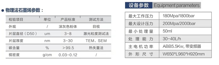 — 纳米材料分散专用设计;高压湍流/均质 — 控温设计:内置冷却盘管 — 密封独特设计:耐腐蚀密封 — 工艺可平行放大 — 变频流量控制器 — 过压自动停机保护 — 陶瓷/金刚石核心部件 采用我司石墨烯专用设备,物理法石墨烯的制备工艺: (物理高压爆破法) 1步、石墨液体浆料的混合 膨胀石墨+去离子水+分散剂+消泡剂+多功能助剂投入高速分散罐中,使用高速搅拌机进行固、液态高速分散、搅拌,搅拌均匀后将石墨浆料通过气动隔膜泵打入待中转罐子中,等待研磨预处理。 2步、石墨液体浆料的预处理 搅拌均匀的石墨浆料经过砂磨机研磨破碎,更近一步的预分散处理,使其粒径达到进入石墨烯高压爆破设备的进料要求,大约研磨2遍左右。 3步、除铁过滤 研磨过后的石墨浆料经过除铁过滤器进行铁离子去除。 4步、高压爆破处理(石墨烯分散液的制备) 把研磨处理后的石墨浆料经过石墨烯高压设备在超高压状态下(200Mpa)进行爆破、撕裂、剪切、剥离使其结构产生变化,得到石墨烯浆料。此项工艺根据最终石墨烯的应用要求可以做重复剥离。 5步、石墨烯液体喷雾干燥 把得到的石墨烯浆料经过干燥得到石墨烯粉体。 应用领域 — 石墨烯/碳纳米管分散液制备 — 导电油墨分散/粉碎 — 打印油墨分散 — 二氧化硼/二氧化钼分散、剥离