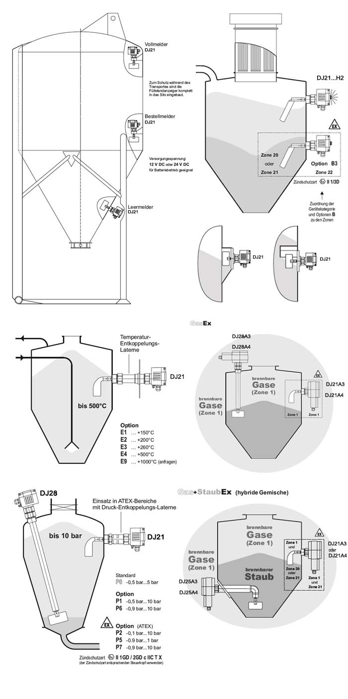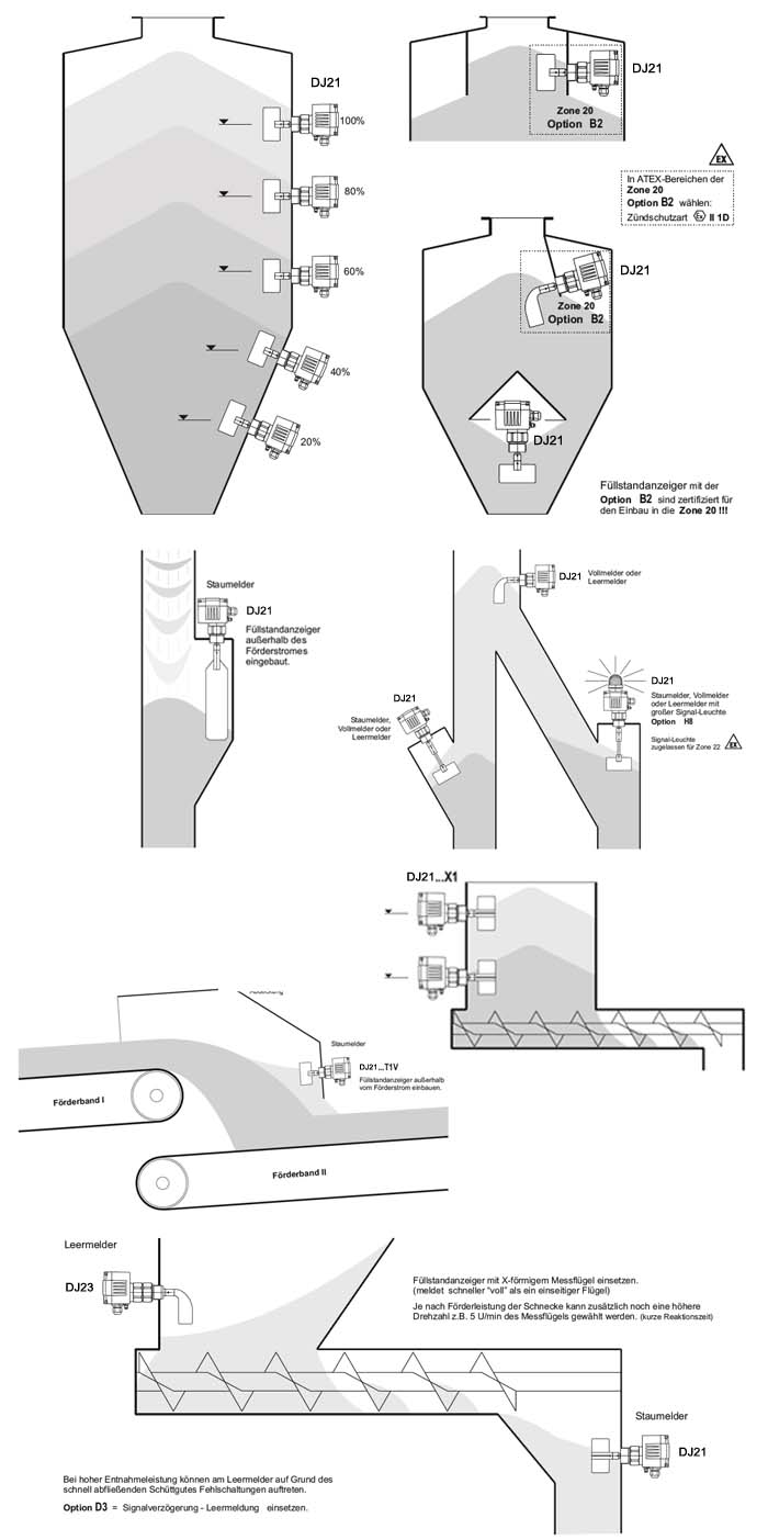 应用范围 DJ21广泛应用于固体散装物料如:粉末、粒状和粗粒度的位置测量。 DJ21在各种应用中的*小或*大值水平点报告中可靠和准确的。 因此,此限位开关也被用在许多行业: •化肥的灌装机的料斗中的位置指标 •用于温度高达200℃的塑料颗粒机内的*监测 •在奶粉储罐中的满仓监测 •在制药工业中的各种原料在反应器中料斗的需求指标 粮食筒仓,谷物粉磨机,饲料装置,水泥,混凝土搅拌设备,沙子,卵石,砂砾,球团矿木材,木材废料,木头碎片,筒仓散装货物,料仓,塑料筒仓,大型筒仓,容器,卸出输送管,输送机,升降机,输送机传送带,装卸设备,加载料仓,除尘器