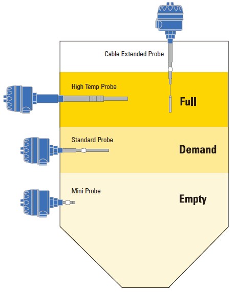 美国BlueLevel射频导纳料位计(料位开关)是一种从电容式测量原理而发展起来的,是电容物位开关控制器的替代产品,在欧美国家已被广泛应用,*用户也在用射频导纳物位开关替换旧的仪表。它可以测量几乎所有物料而不受物料的密度、化学成分、颗粒大小、导电特性和沉积粘度等参数变化的影响。广泛地应用于固体、液体、粉体、浆体、等多种物料的测量。 技术优势: 通用AC/ DC电源 简单的校准 多探头版本 双刀双掷继电器输出 失电保护模式:低位或高位故障报警 不怕粘料和挂料 稳定性好 不受温度影响 *高过程温度(842˚F/450˚C) 外壳IP65(NEMA4X型) 工作原理 射频导纳料位计(料位开关)的结构分为:主电极和补偿电极。在主电极与补偿电极之间分别施加一组RF射频信号,因此具备良好的抗粘附、抗挂料等特性,是替代电容料位开关的新型物/液位测量仪表。 射频导纳料位计由于保护电极的存在,检测电路将测量电极和保护电极的信号进行比较,实现并克服了物料粘附对物位测量的影响。 技术参数 射频导纳料位计标准传感器规格包括: - 标准探头(12.8“/326mm 插入长度) - 微型探头(2.5“/63mm) - 电缆扩展探头(25'/7.6m *长) - 高温探头(17.8“/450mm) - 超高温度探头(22.8“/580mm) 技术数据: 电源:20-250VAC/DC,50/60HZ 消耗:25VA 外壳防护等级:IP65(NEMA4X型) 灵敏度:0.3PF 环境温度:-40˚F*+176˚F(-40˚C*+80˚C) 过程温度: 标准 -40˚F*302˚F(-40˚C*+150˚C) 迷你 -40˚F*302˚F(-40˚C*+150˚C) 钢缆 -40˚F*302˚F(-40˚C*+150˚C) 高温 -40˚F*450˚F(-40˚C*+232˚C) 超高温 -40˚F*842˚F(-40˚C*+450˚C) *大压力:588psi(40Bar) 就地指示: 报警 - 红色 普通 - 蓝 输出:双刀双掷继电器,5A @240VAC 延时:0-30秒可调 探头材质:不锈钢 绝缘材料: 标准 PTFE 迷你 PTFE 钢缆 PTFE 高温 PEEK 超高温陶瓷 外壳:压铸铝,粉末涂层,NEMA类型4X,IP65 认证:CE标志 应用范围 射频导纳料位开关被广泛地应用于固体、液体、粉体、浆体、等多种物料的测量。
