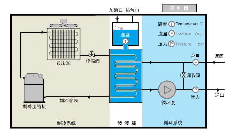 产品特点 * 制冷量大,系列齐全,从10kW~100kW.可按需定制; * 双窗口双色数显精密温控器,控温精度可达±0.2℃; * 无纸记录仪功能,自动保存测量值,历史数据可查询; * 可选去离子装置,可选电导率控制,满足特殊水质要求; * 高压、低压、过载、水位、相序等多种保护,保证机器安全运行。 应用领域 * 应用于工业的生产过程--塑料工业:准确的控制各种塑料加工之模温,缩短啤塑周期,保证产品质量的稳定; * 应用于工业的生产过程--电子工业:稳定电子元件内部在生产线上的分子结构,提高电子元件的合格率; * 应用于超声波清洗行业,有效地防止昂贵的清洗剂挥发和挥发给人带来的伤害; * 应用于工业的生产过程--机械工业:控制油压系统压力油温度,稳定油温油压,延长油质使用时间,提高机械润滑的; * 应用于工业的生产过程--电镀行业:控制电镀温度,增加镀件的密度和平滑,缩短电镀周期,提高生产效率,改善产品质量; 工作原理工业冷水机是先向机内水箱注入一定量的水,通过制冷系统将水冷却,再由水泵将低温冷冻水送入需冷却的设备,冷冻水将需要冷却的设备的热量带走后温度升高再密闭回流到水箱,达到冷却的作用。冷却水温可根据要求自动调节,长期使用可节约用水。因此,工业冷水机也是一种标准的节能环保设备。 工业冷水机工作原理图: