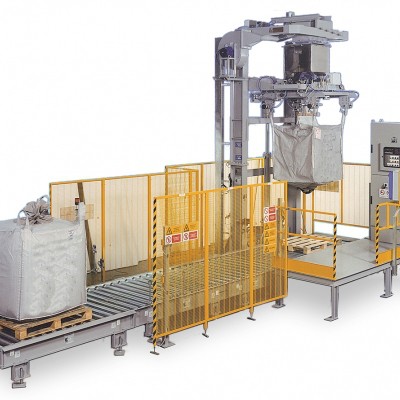 升降结构沿垂直方向上下移动,能使用不同规格的大袋,充分体现多功能的特点(大袋高度自900到1800mm不等)。该设备可附加的选项有托盘自动辊道输送和空托盘自动仓库装置。生产速度可达每小时50个大袋。