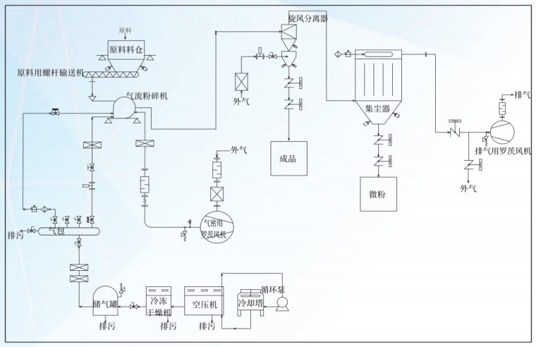 工作原理 1)物料通过星形阀给入料仓,螺杆加料器将物料送入粉碎室或直接给入粉碎室内; 2)压缩空气通过粉碎喷嘴急剧膨胀加速产生的超音速喷射流在粉碎室下部形成向心逆喷射流场,在压差的作用下使磨室底部的物料流态化,被加速的物料在多喷嘴的交汇点汇合,产生剧烈的冲击、碰撞、摩擦而粉碎; 3)经粉碎的物料随上升的气流一起运动至粉碎室上部的一定高度,粗颗粒在重力的作用下,沿磨室壁面回落到磨室下部,细粉随气流一起运动到上部的涡轮分级机。 4)在高速涡轮所产生的流场内,粗颗粒在离心力作用下被抛向筒壁附近,并随失速粗粉一起回落到磨室下部再进行粉碎。 5 )符合细度要求的微粉则通过分级片流道,经排气管输送至旋风分离器作为产品收集,少量微粉由袋式捕集器作进一步气固分离 ,净化空气由引风机排出机外。 6)连接管可使料仓与粉碎室的压力保持一致。 7)料仓上、下料位由精密料位传感器自动控制星形阀给料,粉碎室料位由分级机上动态电流变送器自动控制螺杆加料器进料速度,使粉碎始终处于较佳状态。 工作特点 1、粉碎依靠粉体之间的相互撞击来完成,与腔体冲击概率低,磨损轻,设备维护成本低廉; 2、粉碎分级一体式设计,产品出料粒径均匀可控,分布范围窄且无大颗粒混入,特别适用于对D90到Dmax之间有粒径要求的颗粒; 3、接粉部(含分级轮)可根据客户要求,进行定制,例304/316/316L/氧化铝/氧化锆/特氟龙/碳化钨等;