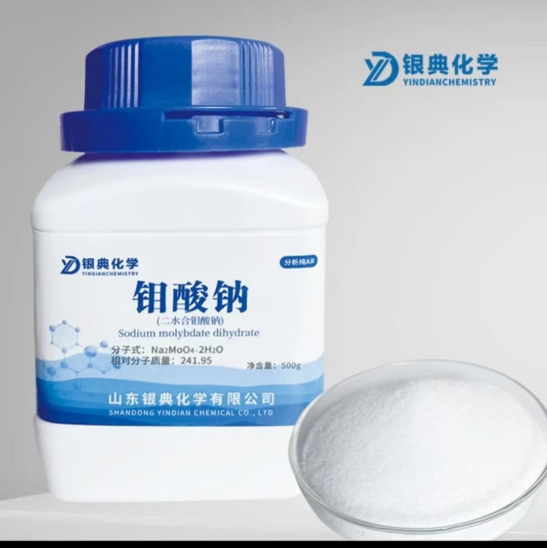 - 分析化学:可与磷酸盐、硅酸盐等形成络合物,用于测定磷、硅等元素含量,如通过生成磷钼酸钠杂多酸进行比色分析。 - 化工与冶金:作为缓蚀剂添加到工业循环水中,抑制金属(如钢、铜)腐蚀;也是制备钼化合物(如三氧化钼)和金属钼的原料,用于冶金行业提炼钼。 - 颜料与陶瓷:用于制造含钼颜料,如钼橙,赋予涂料、油墨鲜艳色泽;在陶瓷釉料中添加可改善釉面性能和颜色。 - 农业与微生物:作为微量元素肥料,为植物补充钼元素,促进固氮和生长;在微生物培养中,可作为培养基成分。 - 其他领域:在纺织工业中作防火剂,在医药领域用于制备含钼药物,实验室中则作为分析试剂或催化剂使用。 |