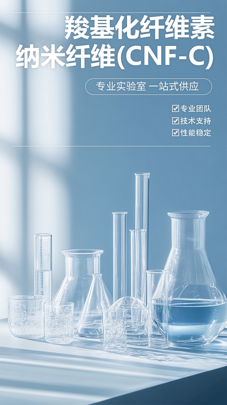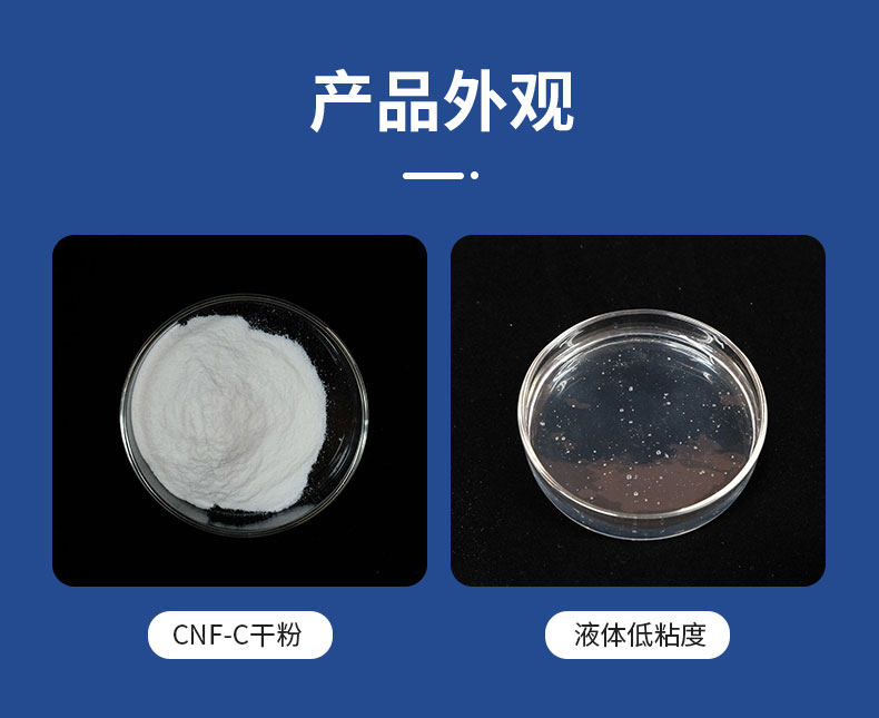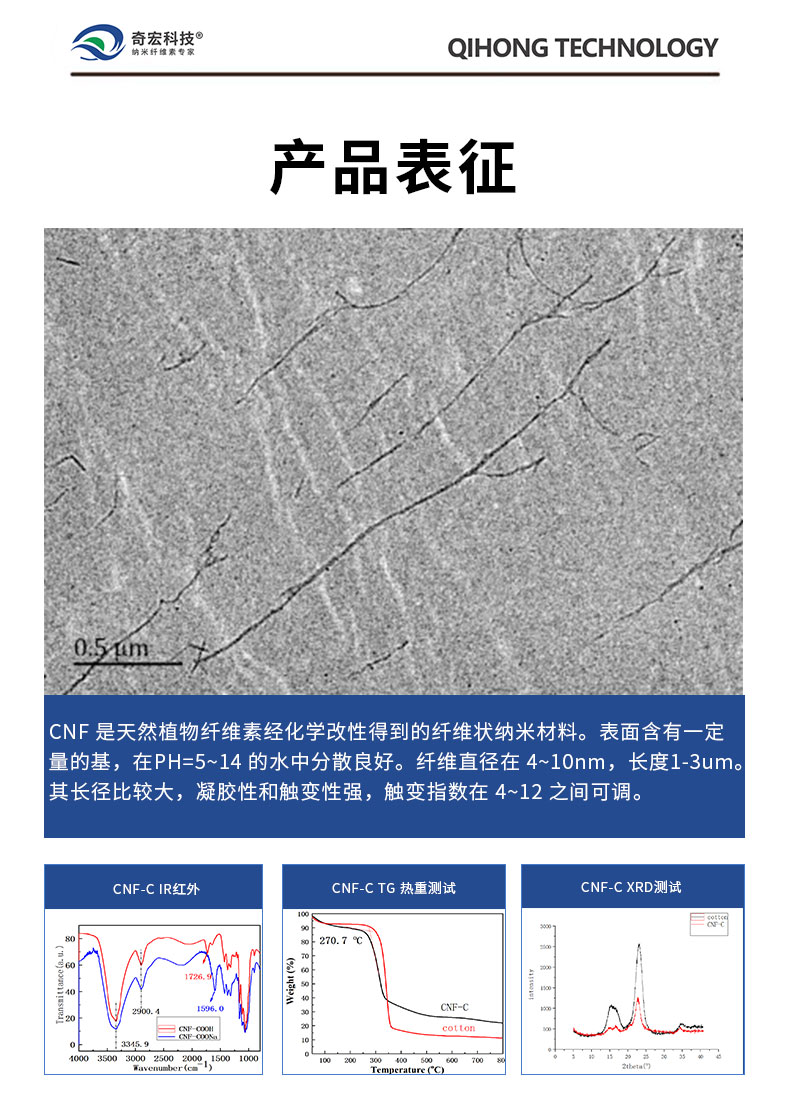 CNF 是天然植物纤维素经化学改性得到的纤维状纳米材料。表面含有一定量的羧基,在PH=5~14 的水中分散良好。纤维直径在 4~10nm,长度 1-3um。其长径比较大,凝胶性和触变 性强,触变指数在 4~12 之间可调。
