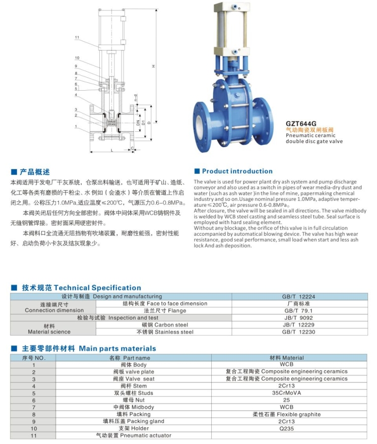本阀适用于发电厂干灰系统,仓泵出料输送,也可适用于矿山、造纸化工等各类有磨损的干粉尘、水,例如(灰渣水)等介质在管道上作启闭之用。公称压力1.0MPa,适应温度≤200℃,气源压力0.6-0.8MPa。 本阀关闭后任何方向全部密封。阀体中间体采用WCB铸钢件及无缝钢管焊接。密封面采用硬密封件。 本阀料口全流通无阻挡物有吹堵装置,耐磨性能强,密封性能好、启动负荷小卡灰及结灰现象少。