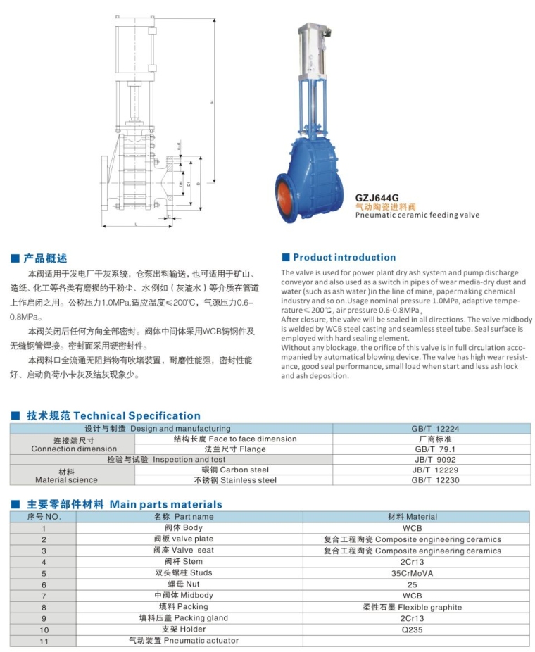 本阀适用于发电厂干灰系统,仓泵出料输送,也可适用于矿山、造纸化工等各类有磨损的干粉尘、水,例如(灰渣水)等介质,或有软颗粒但又有腐蚀性的介质在管道上作启闭之用。公称压力1.0MPa,适应温度≤200℃,气源压力0.6-0.8MPa。 本阀关闭后任何方向全部密封。阀体中间体采用WCB铸钢件及无缝钢管焊接。密封面采用硬密封件。 本阀料口全流通无阻挡物有吹堵装置,耐磨性能强,密封性能好、启动负荷小卡灰及结灰现象少。