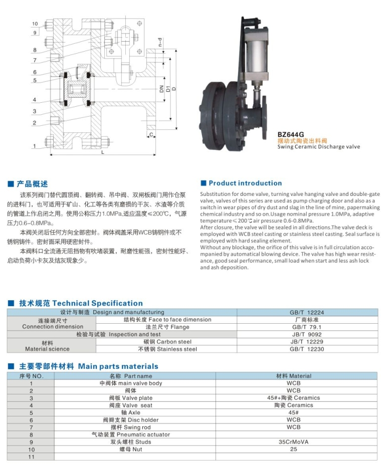 该系列阀门替代圆顶阀、翻转阀、吊中阀、双闸板阀门用作仓泵的进料门,也可适用于矿山、化工等各类有磨损的干灰、水渣等介质的管道上作启闭之用。使用公称压力1.0MPa,适应温度≤200℃,气源压力0.6-0.8MPa。 本阀关闭后任何方向全部密封。阀体中间体采用WCB铸钢件及无缝钢管焊接。密封面采用硬密封件。 本阀料口全流通无阻挡物有吹堵装置,耐磨性能强,密封性能好、启动负荷小卡灰及结灰现象少。