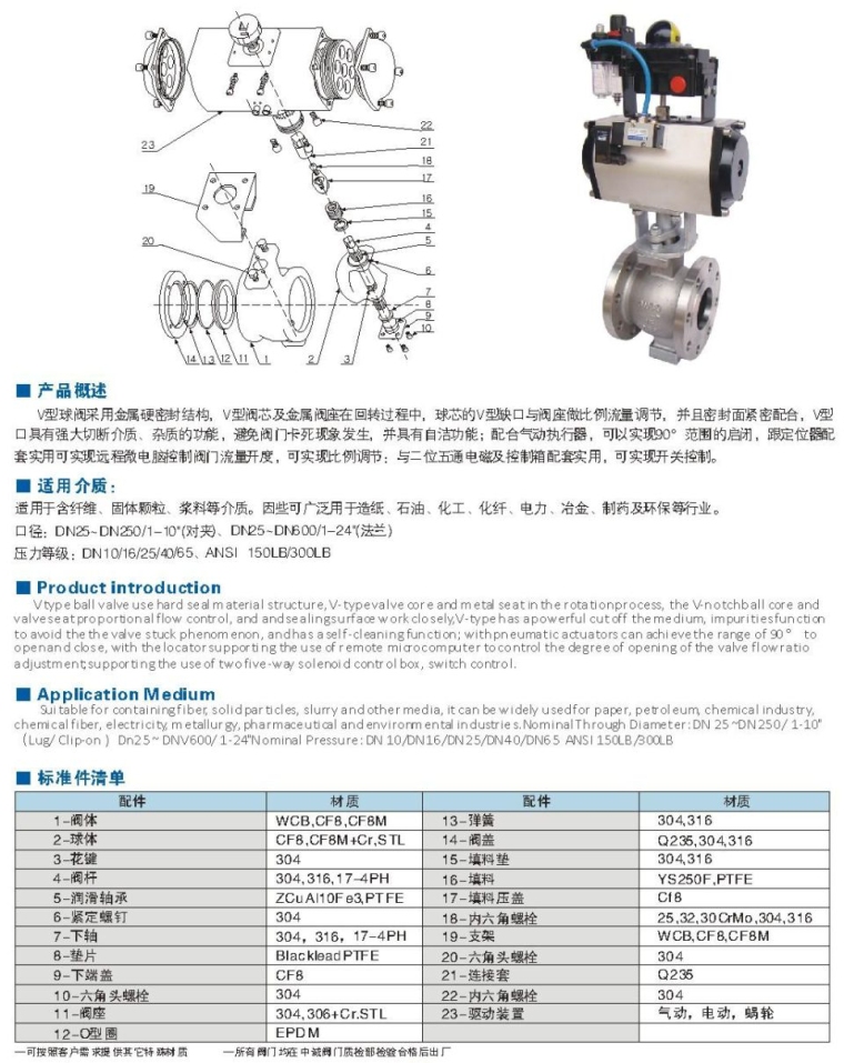V型球阀采用金属硬密封结构,V型阀芯及金属阀座在回转过程中,球芯的V型缺口与阀座做比例流量调节,并且密封面紧密配合,V型口具有强大切断介质、杂质的功能,避免阀门卡死现象发生,并具有自洁功能;配合气动执行器,可以实现90°范围的启闭,跟定位器配套实用可实现远程微电脑控制阀门流量开度,可实现比例调节:与二位五通电磁及控制箱配套实用,可实现开关控制。 适用介质: 适用于含纤维、固体颗粒、浆料等介质。因此可广泛用于造纸、石油、化工、化纤、电力、冶金、制药及环保等行业。 口径:DN25~DN250/1-10"(对夹)、DN25~DN600/1-24"(法兰) 压力等级:DN10/16/25/40/65、ANSI 150LB/300LB