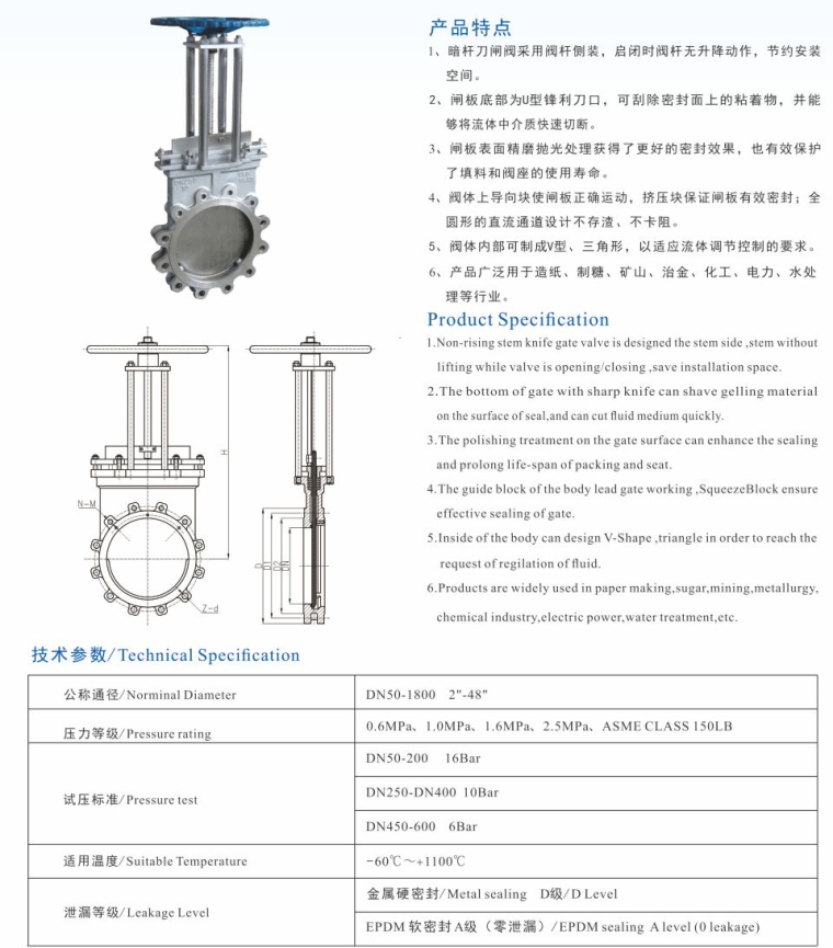 产品特点 1、暗杆刀闸阀采用阀杆侧装,启闭时阀杆无升降动作,节约安装空间。 2、闸板底部为U型锋利刀口,可刮除密封面上的粘着物,并能够将流体中介质快速切断。 3、闸板表面精磨抛光处理获得了更好的密封效果,也有效保护了填料和阀座的使用寿命。 4、阀体上导向块使闸板正确运动,挤压块保证闸板有效密封;全圆形的直流通道设计不存渣、不卡阻。 5、阀体内部可制成V型、三角形,以适应流体调节控制的要求。 6、产品广泛用于造纸、制糖、矿山、治金、化工、电力、水处理等行业。