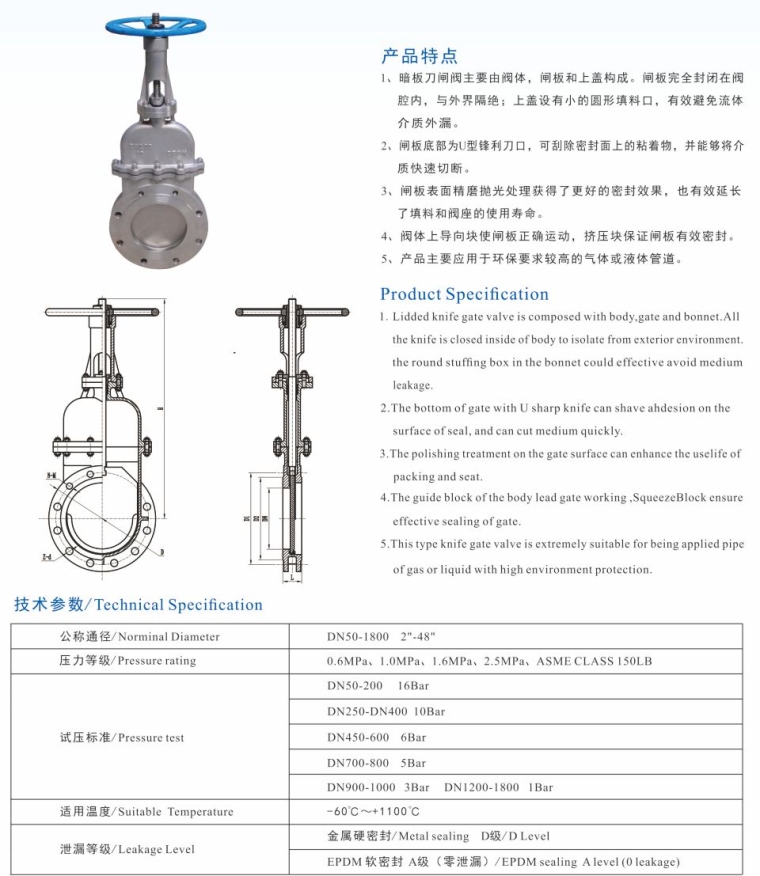 产品特点 1、暗板刀闸阀主要由阀体,闸板和上盖构成。闸板完全封闭在阀腔内,与外界隔绝;上盖设有小的圆形填料口,有效避免流体介质外漏。 2、闸板底部为U型锋利刀口,可刮除密封面上的粘着物,并能够将介质快速切断。 3、闸板表面精磨抛光处理获得了更好的密封效果,也有效延长了填料和阀座的使用寿命。 4、阀体上导向块使闸板正确运动,挤压块保证闸板有效密封。 5、产品主要应用于环保要求较高的气体或液体管道。