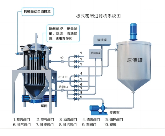 BL系列密闭板式过滤机是一种高效、节能、密闭操作的过滤设备,它广泛用于化工、石油、涂料、食品、制药等行业。BL系列密闭板式过滤机结构独特,体积小,过滤效率高、滤液透明度和细度好,不消耗滤纸、滤布,而只消耗少量的助滤剂,因而过滤成本很低,设备操作、维护、清理方便 1.自动排渣:机械振动自动排渣,打开蝶阀,启动振动排渣装置,振动清渣,降低工人劳动强度,实现连续作业。 2.特制滤板,无需滤布、滤纸,自动排渣过滤机采用特制不锈钢复合型编织筛网,耐腐蚀、好清洗、寿命长,可连续使用3-5年,维护成本低。 3.密闭环保:符合环保标准,管道连接,全密闭式过滤,产品不挥发、不抛失,品质好 4.节能效率高:过滤液体中的料渣或活性炭(白土),或脱色过滤,可完全替代板框过滤机。
