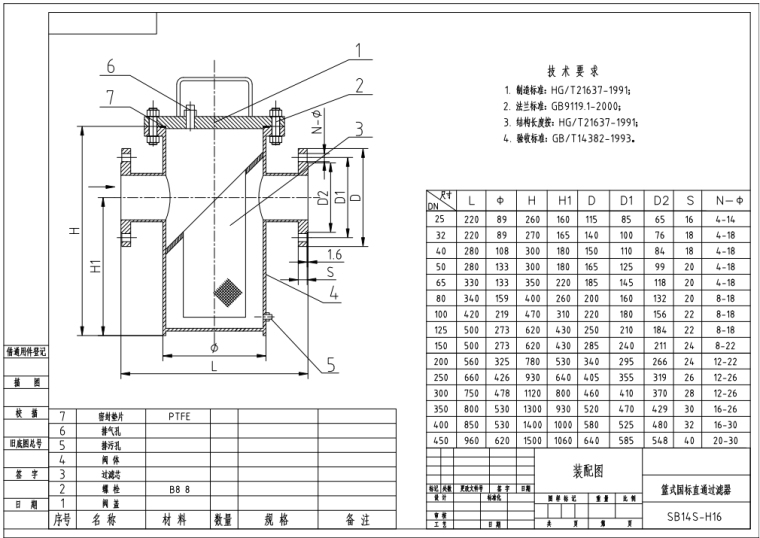 篮式过滤器用于油或其它液体管道上,过滤管道里的杂物,过滤孔面积比通径管面积大2-3倍.远远超过Y型、T型过滤器过滤面积。滤网结构与其它过滤网不一样,因形状像篮子,故名篮式过滤器。 篮式过滤器主要由接管、筒体、滤篮、法兰、法兰盖及紧固件等组成。安装在管道上能除去流体中的较大固体杂质,使机器设备(包括压缩机、泵等)、仪表能正常工作和运转,达到稳定工艺过程,保障安全生产的作用。 篮式过滤器是除去液体中少量固体颗粒的小型设备,可保护压缩机、泵、仪表和其他的正常工作,当流体进入有一定规格的滤网的滤桶后,其杂质被阻挡,而清洁的滤液则由过滤器出口排出,当需要清洗时,只要将可拆卸的滤桶取出,处理后重新装入即可,因此,使用维护极为方便。已广泛应用于石油、化工、医药、食品、环保等行业。若将其串连的安装在泵的入口或系统管线的其他部位,则既可以延长泵和其他设备的使用寿命,又能保证整个系统的安全。 技术参数