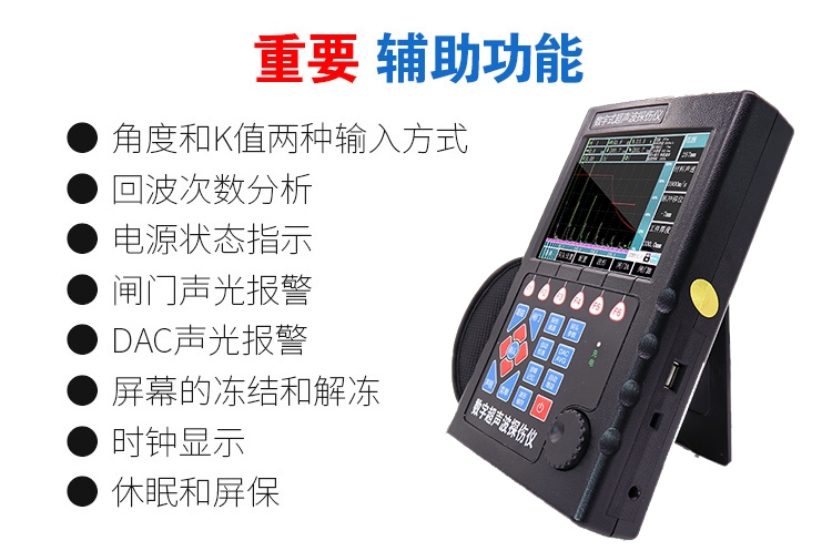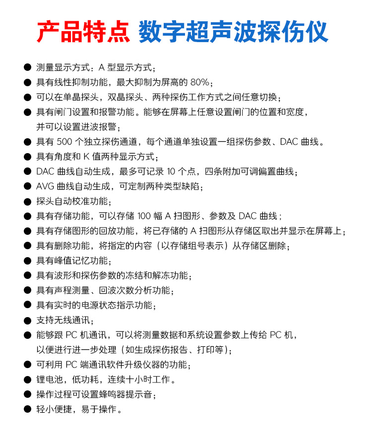 AG-800数字超声波探伤仪能够快速便捷、无损伤、精确地进行工件内部多种缺陷如裂纹、焊缝、气孔、砂眼、 夹杂、折叠等的检测、定位、评估及诊断,广泛应用于各类实验室、工程现场检测、学校科研单位、建设工程质 量检测、锅炉压力容器制造、电力行业、工程机械制造业、钢铁冶金业、钢结构制造、船舶制造、石油天然气装 备制造等需要缺陷检测和质量控制的领域。