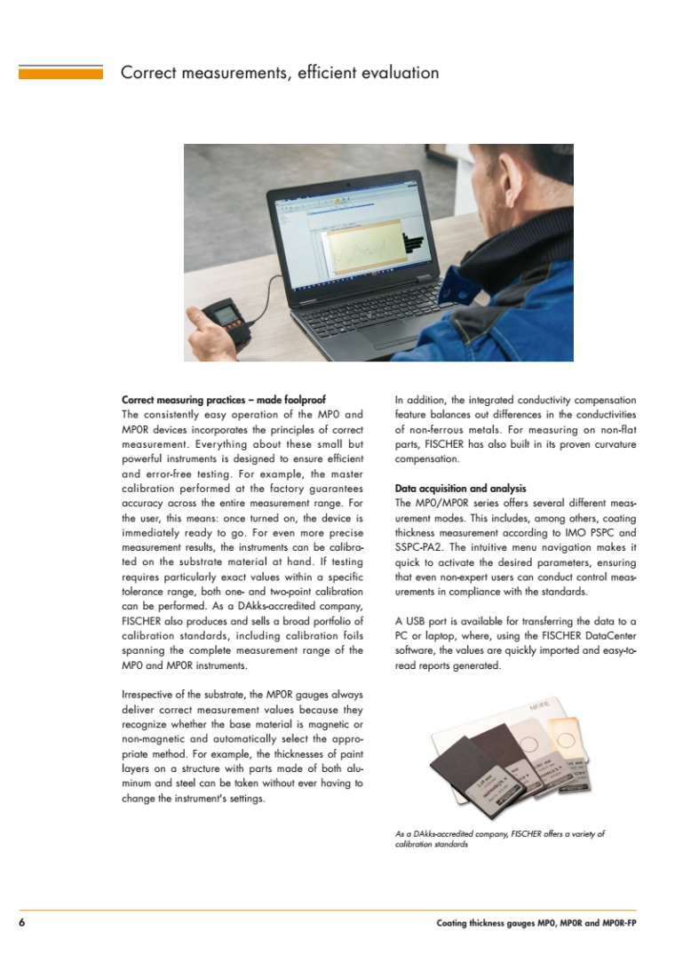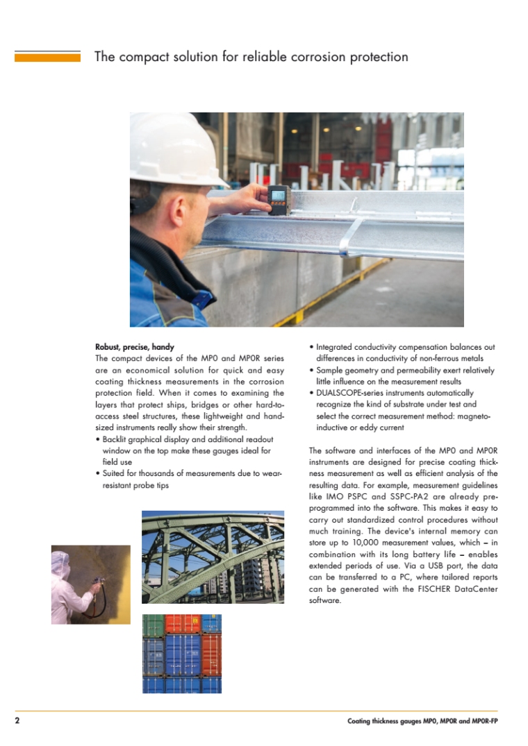小巧、方便且稳固 – MP0 系列仪器能够简便、快速且无损地测量涂层厚度。配有两个显示屏、一个特别坚固的外壳和耐磨损的探头,它们是可以直接用于现场可靠测量的理想设备。特性: 由于极为耐用的仪器构造,即使在简陋的环境条件下也可进行可靠的测量 借助两个独立枢轴与发光显示屏,即使在难以触及的测量点也可进行简单操作 测量符合标准,具有适用于 IMO PSPC 与 SSPC-PA2 的特殊模式 由于设备的结构紧凑以及直观的单手操作概念,可快速、重复进行准确测量 应用: PERMASCOPE® 用于钢和铁上的涂镀层 ISOSCOPE® 用于铝和其他非铁磁性金属上的涂镀层 DUALSCOPE® 用于钢、铝和其他非铁磁性金属上的涂镀层,无需更换仪器 非铁磁性金属、铁或钢上的微米级涂镀层 钢铁上由非铁磁性金属制成的厚涂层或保护涂镀层 |