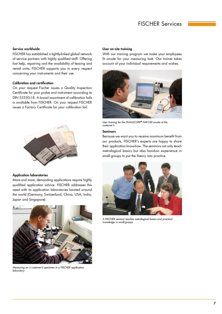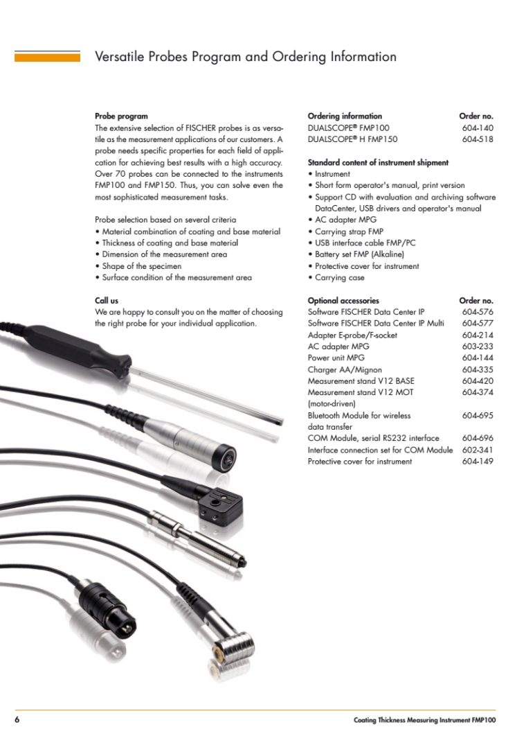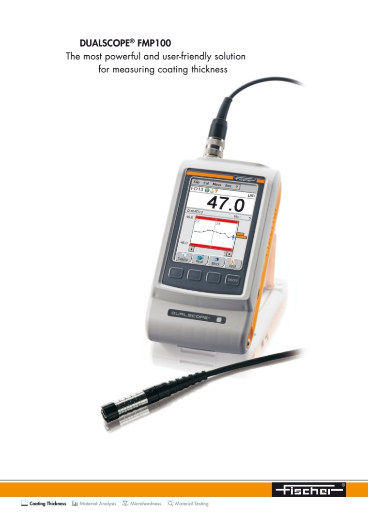凭借 DUALSCOPE® FMP100 ,FISCHEER可提供高性能手持式测量仪器,用于专业涂镀层厚度测量中各种要求严苛的任务。这些仪器配备触摸屏和 Windows™ CE 操作系统,操作快速且直观。更大的系统内存意味着您可以执行数千个测量任务。具有各种统计与分析功能,可用于处理结果。 此外,借助 DataCenter IP 检查计划软件,您可以编译单个图形计划,以确保生产中的工作流程一致,或使未经培训的用户快速熟悉正确的测量程序。特性: 可更换的探头可为各种测量任务提供灵活选择 在高分辨率图形触摸屏上详细展示测试方案与检查计划 使用 Windows™ CE 操作系统进行直观的操作 通过磁感应法和电涡流法进行铁和非铁磁性金属上的涂镀层测量 测量符合标准,具有适用于 IMO PSPC、 SSPCPA2、QUALANOD 或 QUALICOAT 的特殊模式 应用: DUALSCOPE® 用于钢、铝和其他非铁磁性金属上的涂镀层,无需更换仪器 FMP150:非铁磁性金属或绝缘体上的镍涂镀层 非铁磁性金属、铁或钢上的微米级涂镀层 非铁磁性制成的厚涂镀层或钢上的保护涂镀层 |