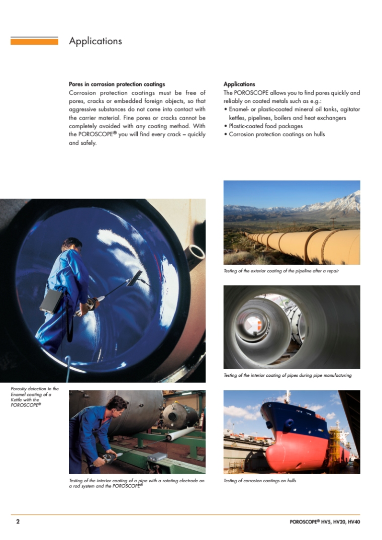 塑料保护涂层可使包装保持无菌,适用于医疗产品或真空包装食品。例如:用于保护箱体、船体或管道免受腐蚀的塑料或搪瓷涂层。POROSCOPE 系列,作为一款坚固耐用的便携式测量设备,非常适合快速、简便地测试非导电保护涂层,甚至可发现极其细微的小孔和裂痕。特性: 用于检测表面上的小孔和裂痕的便携式孔隙率测试设备 通过显示屏和旋转/按钮开关进行简单直观的操作 通过保护电阻、绝缘并接地的手柄以及仅在测试头中产生高压,确保安全操作 检测到孔隙时将发出声音信号 提供三个电压范围:0.5 - 0.8 kV (POROSCOPE HV5)、4 - 20 kV (POROSCOPE HV20) 以及 8 - 20 kV (POROSCOPE HV40) 持续可调节的测试电压和适应性强的灵敏度 可用于不同应用领域的多种电极 应用: 矿物油箱、压力容器、管道、锅炉以及热交换器上的搪瓷或塑料涂层 船体上的防腐蚀涂层 用于食品和药品的塑料涂层包装 |