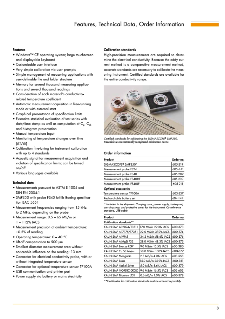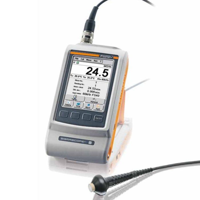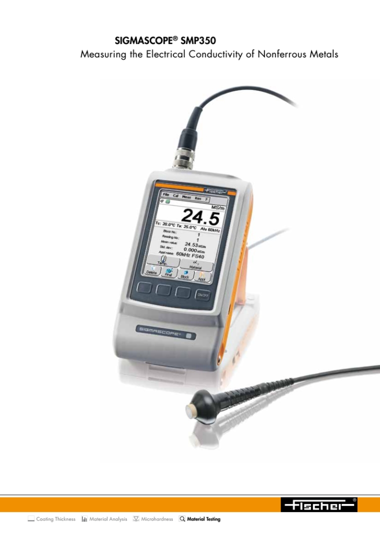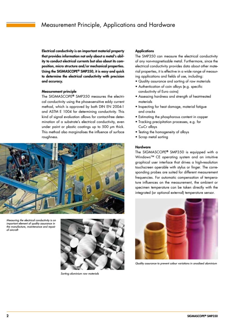 SIGMASCOPE SMP350 是一款结构紧凑的手持式设备,适用于测定非铁磁性金属(如铝或铜)的电导率。通过测得的电导率能够进一步得出与热处理材料的硬度与强度相关的结论。从而建立热损伤与材料疲劳的证据。为此仪器使用了相敏涡流法。该方法经认证可用于符合标准 DIN EN 2004-1 与 ASTM E 1004 的电导率测量。特性: 快速、无损地精确测量有色金属的电导率,符合 DIN EN 2004-1 与 ASTM E 1004 标准 适用于各种应用的电导率探头 根据探头,针对不同渗透深度提供不同测量频率(范围为 15 kHz 至 1 MHz) 针对已知曲率直径的自动曲率补偿(小直径低至 6 mm) 我们提供经过认证的测量标准(以 MS/m 计,%IACS),可追溯至国际公认的校准标准 应用: 针对原材料进行电导率测试,以实现分拣与质量保证 造币中的合金元素检查(例如欧元硬币的电导率) 热处理材料的硬度与强度评估 可因温度波动而改变的机身或类似组件的材料稳定性控制 铜合金或含铜材料中的磷含量估算 沉淀工艺跟踪,例如铜铬合金 合金同质性检查 废料分拣 |