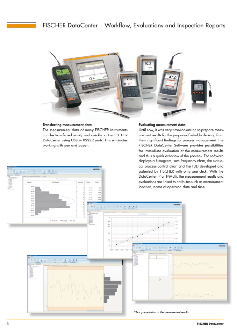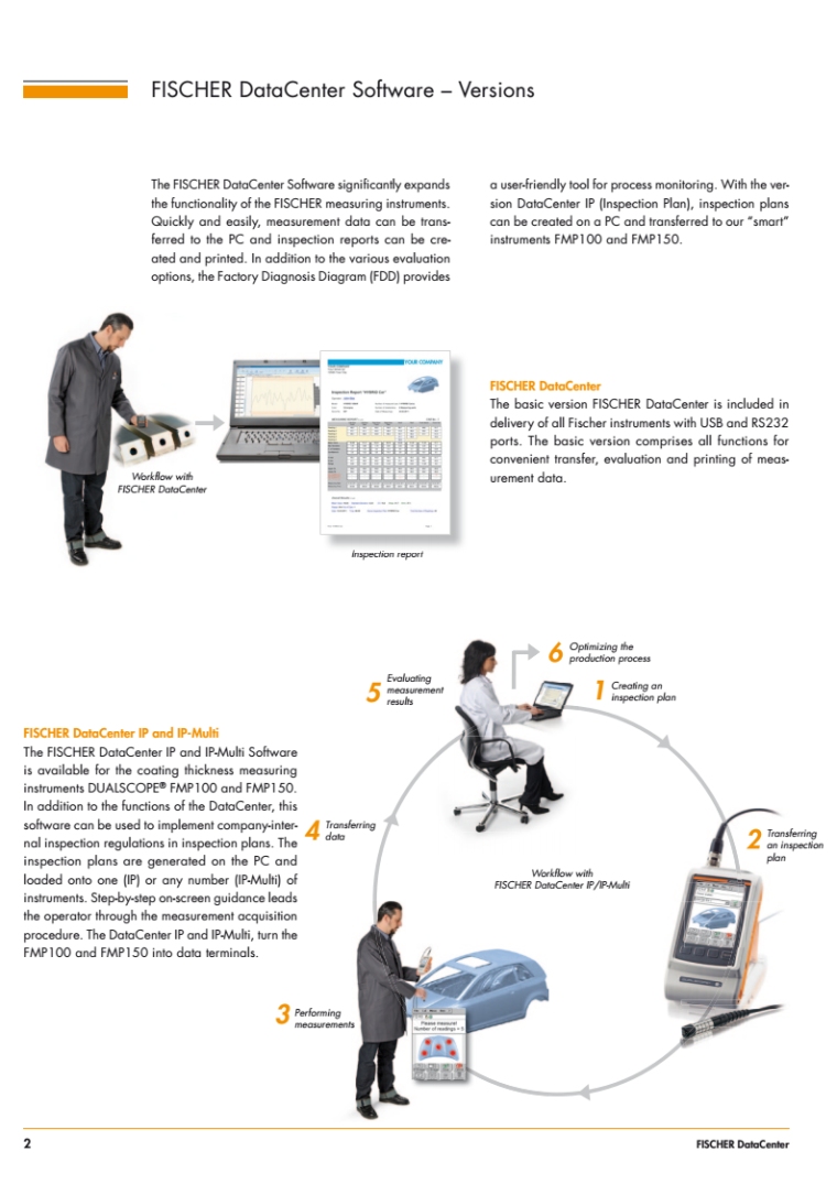 使用 DataCenter IP 软件包轻松创建测试报告与检查计划。使用 DataCenter,您可以轻松地将测量值从测量设备传输到 PC,从而对其进行分析与归档。此高性能软件还可帮助您创建个性化的测试报告模板。由于采用了模块化结构,即使不具备相关技术知识,也能够在测试报告中使用所有分析方法与统计功能。测量值自动插入报告并进行评估。在 PC 上使用 DataCenter IP Inspection Plan 软件,可轻松创建适合便携式 DUALSCOPE FMP150 和 FMP150 涂镀层厚度测量仪的检查策略与测试指南。通过 USB 接口可将检查策略传输至测量设备。然后,测试指南将直接显示在设备的显示屏上,指导用户逐步完成测量任务。如此一来,无论用户的经验如何,都能确保为涂镀层表面质量控制提供一致的测试条件。 特性: 每台接触式测量仪器均免费提供高性能 DataCenter 软件,用于自动分析、呈现以及归档测量值 借助检查计划,即使未经培训的用户也能够快速熟悉标准测量作业 由于无需再对测量值进行手动记录与传输,自动分析可节省时间并能防止错误发生 便携式 DUALSCOPE FMP100 与 FMP150 涂层厚度测量仪器可选配 DataCenter IP Inspection Plan 软件:创建特定检查计划,确保在生产中正确执行测量过程 |