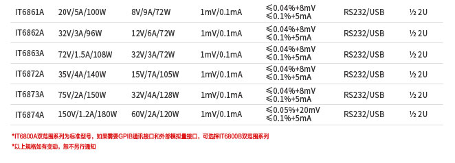 IT6800A系列双范围可编程直流电源(72-180W),每台电源具有两个电压、电流输出范围,一台电源可以当两台使用,极大节约使用者的成本和空间。具有1mV / 0.1mA的高分辨率。同时支持面板List编程和通过计算机进行软件操作,满足更多的通讯需求。适用于实验室测试、产在线生产测试、维修检测等 产品特点 ♦ 双范围输出 ♦ 高准确度和高分辨率 ♦ 低涟波和低噪音 ♦ 远端补偿功能 ♦ 可按照程序所编的电压电流值输出 ♦ 可利用旋钮对电压和电流进行调节 ♦ 过电压保护功能(OVP)及过温度保护功能(OTP) ♦ 标配RS232/USB/GPIB通信接口 *1。 ♦ 可通过计算机进行软件监控 ♦ 具有丰富的 SCPI 指令,方便组建智能化测试平台 *1:仅限IT6800B 双范围系列配置GPIB通信接口。 双范围输出 IT6800A双范围系列具有两个高、低电压范围,客户可以根据测试需求进行切换。当需要高电压输出时,可选择高电压范围,当需要高电流时,可选择低电压。 恒定电压/恒定电流自动转换功能 |
