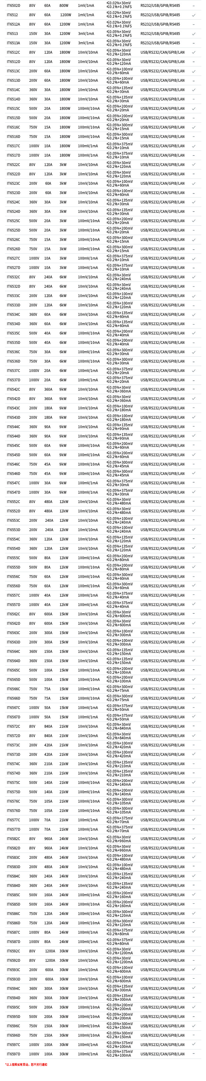 IT6500全系列超过100个机型。功率包含从800W到30KW,以及高达1000V/1200A的输出范围。支持主从并联,主动均流,并在功率扩展后保持单机优异的动态特性。不但有丰富测量功能、高速响应的IT6500C系列,同时也提供高性能、稳定输出的IT6500D系列,用户可以根据需求,轻松选择。应用领域包括汽车、绿色能源、高速测试、大功率测试等多个方面,是一款功能全面、性能优异、适用广泛的直流电源。尤其是