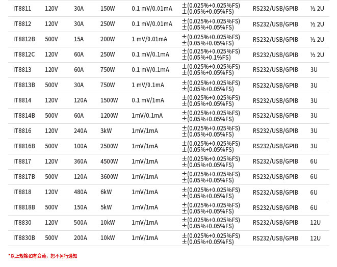 IT8800系列直流电子负载拥有宽广的功率范围150W-10KW,电压电流测量速度均达到50KHz,测试分辨率可达0.1mV/0.01mA,测试电流上升速度0.001A/us~2.5A/us可调,且内置RS232/GBIP/USB通讯接口,参数指标非常优异。产品稳定性高,应用行业宽泛,能满足各种测试需求, ♦ 150-10kW/120-800V/15-500A ♦ CV/CC/CR/CW模式 ♦ 远端量测功能 ♦ 可达0.1mV/0.01mA高分辨率 ♦ 动态模式高达25KHz ♦ 可调电流上升速度.0001A/us~2.5A/us ♦ 电压、电流测量速度高达50KHz ♦ 短路功能,动态测试功能 ♦ CR-LED功能 ♦ 过电压、过电流、过功率、过热、反极性保护 ♦ 记忆容量100组 ♦ 断电保持记忆功能 ♦ 外部模拟量控制 ♦ 标配RS232/USB/GPIB接口 ♦ 支持VISA,USBTMC,SACPI通讯协议 ♦ 可通过计算机进行软件监控 |