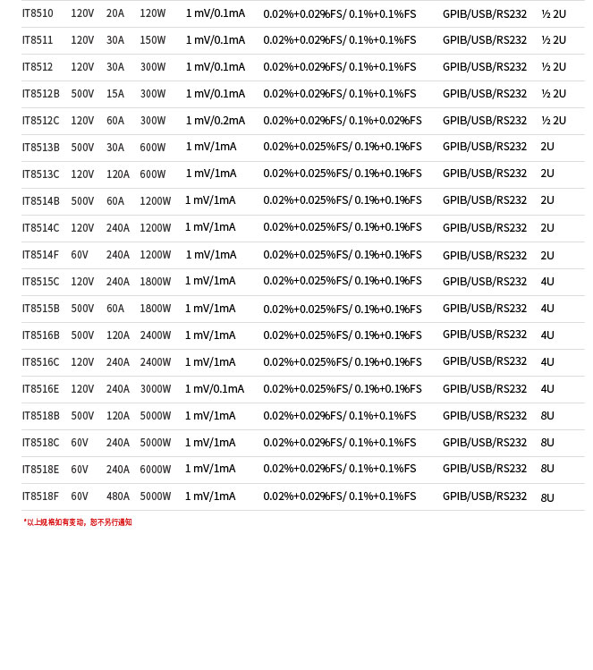 IT8500系列在具有**性价比的同时具备多种操作模式和测试功能,满足客户多元化的测试需求:可编程List输出模式,定电压、定功率、定电流、定电阻模式,远端测量、短路测试、电池测试、动态测试功能。该系列具备良好的低电压带载特性,提供高效率、高精度的测试解决方案,可选配USB/RS232/GPIB通讯接口。 产品特点 ♦ 四种工作模式:定电压/定电流/定电阻/定功率 ♦ 具备自动测试功能,加快测试效率 ♦ 具备电池测试功能 ♦ 具备远程测量功能(四线式测量),可防止大电流时,因测试线内阻造成的电压误差 ♦ 高精度电压及电流测量 ♦ 配合IT-253键盘可快速完成产品测试 ♦ 可选配USB/RS232/GPIB接口 ♦ 可安装于标准19寸机柜 ♦ 具有可编程List输出模式 工作模式 定电流操作模式(CC):在定电流模式下,不管输入电压是否改变,电子负载小号一个恒定的电流。 定电压操作模式(CV):在定电压模式下,电子负载将消耗足够的电流够的电流来使输入电压维持在设定的电压上。 定电阻操作模式(CR):在定电阻模式下,电子负载被等效为一个恒定的电阻,电子负载会随着输入电压的改变来线性改变电流。 定功率操作模式(CW):在定功率模式下,电子负载讲消耗一个恒定的功率,如果输入电压升高,输入电流将减少,功率P(=V*I)将维持在设定功率上。 |