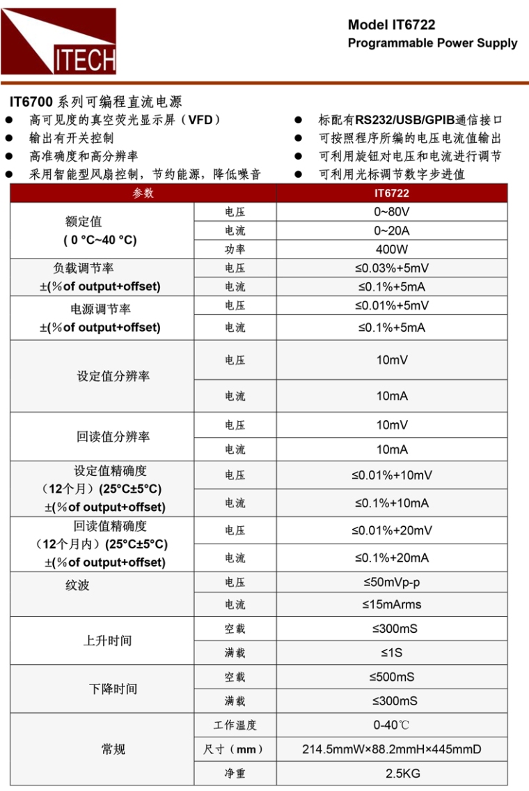 我对您的可编程直流稳压电源IT6722 (80V/20A/400W)产品感兴趣,请发具体的信息及报价,谢谢!