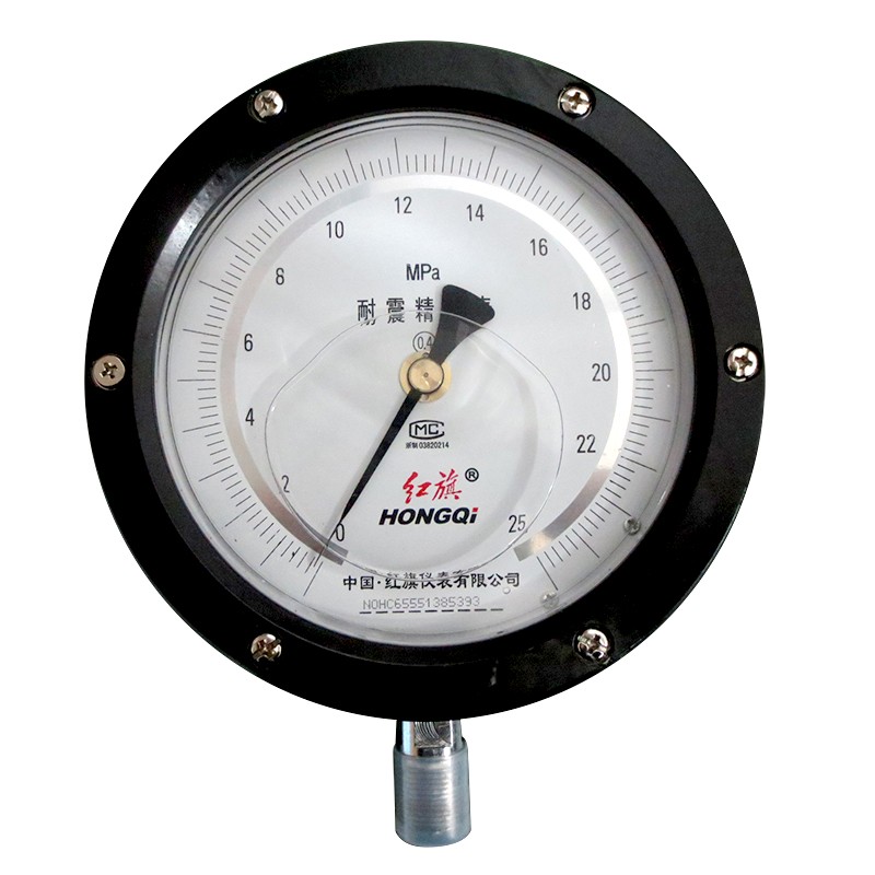 产品简介 耐震精密压力表主要用来校验工业用普通压力表, 也可用于精密测量对铜合金和钢等无腐蚀性、非结晶、 非凝固的各种介质的压力及真空;广泛用于工业生产 过程和精密测量和科学实验等部门。 耐震精密压力表内部充灌阻尼液和配套缓冲装置, 具有良好的耐震性能。 精确度等级:0.4级。 测量范围:0-0.1~0-60MPa 精密压力表的工作原理是:当被测介质的压力作用于弹性元件后,使其产生弹性变形—位移,经拉杆带动传动机构放大,由指示装置指示被测压力。 精密压力表按精度分为:0.25%,0.4% 技术参数 主要技术指标: ○精密压力表测量范围、精确度等级及特点 型号 弹簧管材料 测量范围MPa 精确度等级 结构特点 YB-150A锡磷青铜 铬钒钢 0-0.1;0-0.16;0-O.25 ;0-0.4;0-0.6;0-1;0-1.6; 0-2.5;0-4;0-6;0-10; 0-16;0-25;0-40;0-60 0.4 镜面 YB-150B 0.25 镜面调零 ○精密压力表使用环境条件:5~40℃,相对湿度不大于80%,且环境震动和压力源的波动对仪表的精确读数无影响。 ○精密压力表温度影响:使用环境温度如偏离20±3℃(A型)或20±2℃(B型)时,则须考虑温度附加误差0.4%/10℃ ○精密压力表重量:1kg(A型) 1.4kg(B |