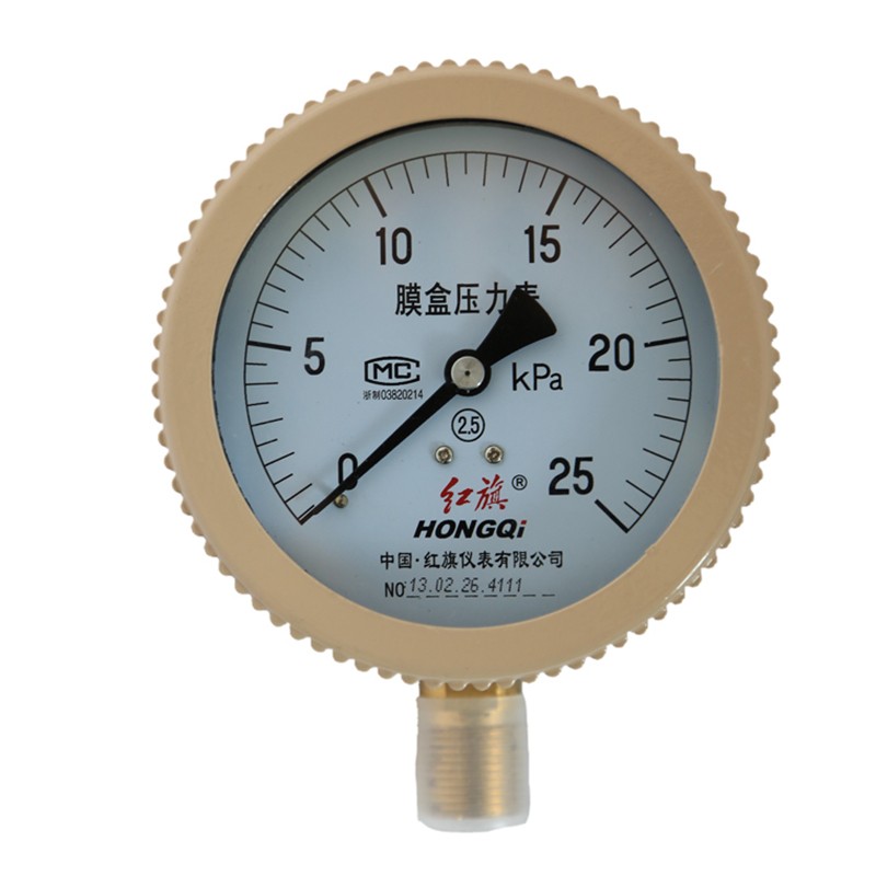 产品应用: 膜盒压力表采用膜盒作为测量微小压力的敏感元件。测量对铜合金不起腐蚀作用、无爆炸危险气体的微压和负压,广泛应用于锅炉通风、气体管道、燃烧装置等及其它类似设备上。 精确度等级:2.5级。 测量范围:0-1.6~0-60KPa, 0-250~0-40000Pa。 正负压、负压。 膜盒压力表采用膜盒作为测量微小压力的敏感元件。测量对铜合金不起腐蚀作用、无爆炸危险气体的微压和负压,广泛应用于锅炉通风、气体管道、燃烧装置等其他类似设备上。 不锈钢膜盒压力表根据导压系统及外壳均采用不锈钢材料制成。应用于耐腐蚀要求较高的工艺流程中对各种气体介质的微压和负压的测量。 不锈钢膜盒压力表参照原膜盒压力表的结构特点而研制的具有耐腐蚀作用的微压表。应用于锅炉通风和气体管道等设备上,在耐腐要求较高的工艺流程中测量各种气体介质的微压和负压。精确度等级:2.5 结构原理: 仪表由测量系统(包括接头、波纹膜盒等),传动机构(包括拔杆机构,齿轮传动机构),指示部件(包括指针与度盘)和外壳(包括表壳、衬圈和表玻璃)所组 成。仪表的工作原理是基于波纹膜盒在被测介质的压力作用下,其自由端产生相应的弹性变形,再经齿轮传动机构的传动并予放大,由固定于齿轮轴上的指针逐将被 测值在度盘上指示出来。还有调零装置,可以方便调整零位。 膜盒压力表的测量范围在-80~60000Pa,但是要根据不同的压力量程选用不同的膜盒压力表,压力在-1000Pa~60000Pa时建议选用圆盘式膜盒压力表,如果压力在-80Pa时建议选用矩形膜盒压力表。 技术参数: