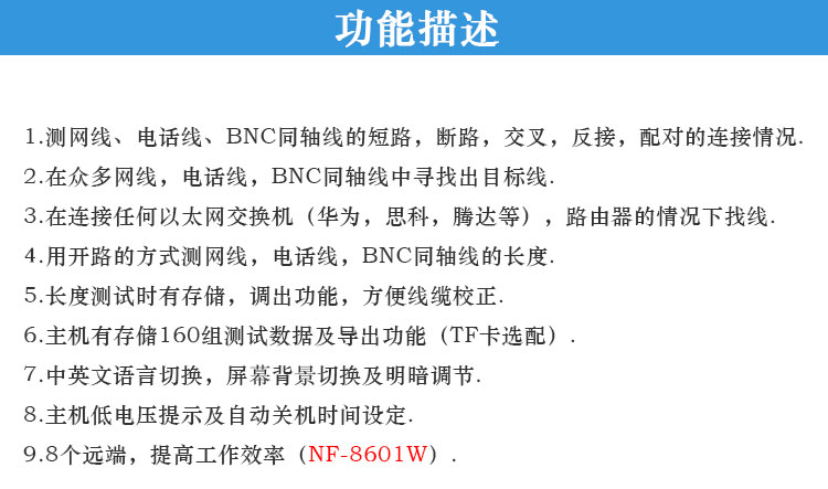 我对您的NF-8601S寻线仪POE交换机巡线器线缆长度断点测线仪网络查线产品感兴趣,请发具体的信息及报价,谢谢!
