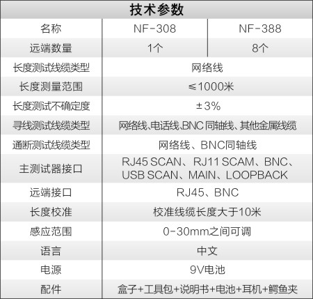产品特点: 1.外观流畅,手感好和贴心的人性化设计,LCD大屏显示,功能智能化选择。 2.可寻网线、电话线、NBC同轴线、USB线及其它金属线缆。 3.可测网线的长度和断点。 功能描述: 1. 寻BNC同轴线、屏蔽与普通网线、四芯网线、电话线、USB线及其它金属线缆等超强抗干扰。 2. 鳄鱼夹延伸寻电线电缆。 3. 可测网线在305米内的长度,可判断短路及断点位置,有校准功能。 4. 可对网线的开路、短接、交叉及支持本机对线,对BNC同轴线短接测试。 5. 自动延时关机和背光功能。 6. 照明灯功能,黑暗环境便于工作。 7. 自检功能,能自动补偿电池电量变化、环境温度变化的影响。 应用范围: *行业设备生产与实验的解决方案。 *网线、电话线、视频线、同轴线、USB线等等销售终端服务与运用。 *通讯电话系统、计算机网络系统、金属导线线路等领域的环境综合布线。 *智能化、信息化及能源导线的综合工程布线、检修、更换。 *计算机网络工程与信息系统集成、计算机信息系统教学与研究。 *其它线缆环境工程。