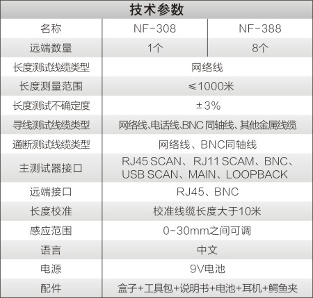 产品特点: 1.外观流畅,手感好和贴心的人性化设计,LCD大屏显示,功能智能化选择。 2.可寻网线、电话线、BNC同轴线、USB线及其它金属线缆。 3.可测网线的长度和断点。 功能描述: 1. 寻BNC同轴线、屏蔽与普通网线、四芯网线、电话线、USB线及其它金属线缆等超强抗干扰。 2. 鳄鱼夹延伸寻电线电缆。 3. 可测网线在305米内的长度,可判断短路及断点位置,有校准功能。 4. 可对网线的开路、短接、交叉及支持本机对线,对BNC同轴线短接测试。 5. 自动延时关机和背光功能。 6. 照明灯功能,黑暗环境便于工作。 7. 自检功能,能自动补偿电池电量变化、环境温度变化的影响。 应用范围: *行业设备生产与实验的解决方案。 *网线、电话线、视频线、同轴线、USB线等等销售终端服务与运用。 *通讯电话系统、计算机网络系统、金属导线线路等领域的环境综合布线。 *智能化、信息化及能源导线的综合工程布线、检修、更换。 *计算机网络工程与信息系统集成、计算机信息系统教学与研究。 *其它线缆环境工程。