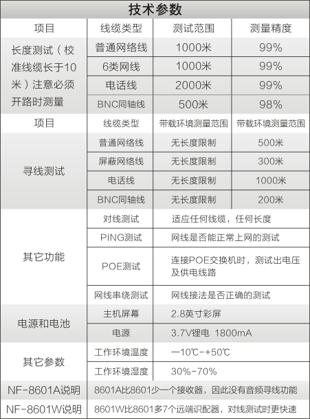 产品特性: 1.对网线进行PING测试, POE测试,串扰测试。 2.精确寻找两芯线的短路位置。 3.长度测量准确度高达99%。 4.2.8英寸彩屏, 人性化图标式设计。 5.测试线缆短路点的位置。 6.寻线时无任何交流电干扰。 7.主机和接收器均是3.7V聚合物锂电池供电, 可重复充电。 8.端口闪烁功能,方便更直观。 功能描述: 1.测网线、电话线、BNC同轴线的短路,断路,交叉,反接,配对的连接情况。 2.在众多网线,电话线,BNC同轴线中寻找出目标线。 3.在连接任何以太网交换机(华为,思科,腾达等),路由器的情况下找线。 4.用开路的方法测网线,电话线,BNC同轴线的长度。 5.长度测试时有存储,调出功能,方便线缆校正。 6.主机有存储160组测试数据及导出功能(TF卡选配)。 7.中英文语言切换,屏幕背景切换及明暗调节。 8.主机低电压提示及自动关机时间设定。