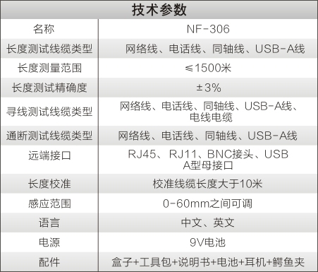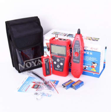 产品特点: 1.无噪音、抗干扰带载寻线。 2.可测试网络线、电话线、同轴线、USB-A线的长度和断点。 3.中、英文切换,带有存储、校准、记忆和调取功能。 4.支持本机对网络线和电话线,LCD直观显示结果。 功能描述: 1.可在交换机、路由器开机带电状态下寻线。 2.能准确判断开路点在某一端(左,右或中间)。 3.对网线进行串扰测试,解决网速慢的潜在故障。 4.主机电压低于6.0V时,自动关机停止工作。 5.可测试网络线、电话线、同轴线、USB-A线的通断,交叉,串扰等连接情况。 6.自动延时关机和背光功能。 7.照明灯功能,黑暗环境便于工作。 8.自检功能, 能自动补偿电池电量变化, 不受环境温度变化的影响。