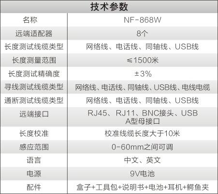 产品特点: 1.无噪音、抗干扰带载寻线。 2.可测试网络线、电话线、同轴线、USB线的长度和断点。 3.中、英文切换,带有存储、校准、记忆和调取功能。 4.可测试网络线、电话线、同轴线、USB线的通断,交叉,串扰等连接情况。 5.带有8个远端,提高工作效率。 功能描述: 1.可在交换机、路由器开机带电状态下找线。 2.对网线进行串扰测试,解决网速慢的潜在故障。 3.能准确判断开路点在某一端(左,右或中间)。 4.主机电压低于6.5V时,自动关机停止工作。 5.支持本机对网络线,LCD直观显示结果。 6.自动延时关机和背光功能。 7.照明灯功能,黑暗环境便于工作。 8.自检功能, 能自动补偿电池电量变化, 不受环境温度变化的影响。 9.电缆定位, 8个远端被动测试插口(识别号1D1-ID8),依次可以对8组线缆。