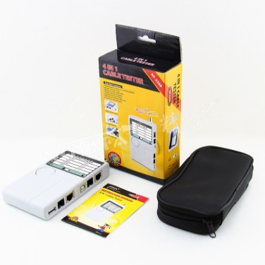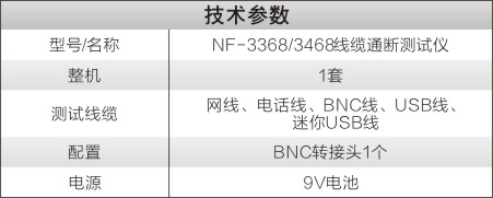 产品特点: 1.可测网络线、电话线、BNC线、USB线的连接、交叉、短接。 2.操作简单、快速、蜂鸣器以语音方式提示测试结果,LED指示连接与错误。 3.有自动省电功能,具有电池低电压提示功能。 功能描述: 1.单键测试简单。 2.测试已装好接头的线缆或跳线。 3.蜂鸣声提示测试结果。 4.可测网络线、电话线、BNC线、迷你USB线的连接、交叉、短接。