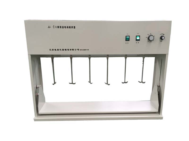 JJ-4六联电动搅拌器具有美观大方、结构先进、精度高、噪声小、操作方便、工作效率高、耐腐蚀等特点。可以应用于净水设备设计、模拟试验、净水处理部门净水耗矾量的实验试验;各种混凝剂混凝效果的研究;各种助凝剂效果的比较,是科研、化工、教学、印染和环保废水处理等部门不可缺少的高效能设备。 一、结构原理 本机采用220V 50Hz交流电源。用电子调速电动机分别控制六根搅拌棒搅拌。调节电子调速器可实现无级变速。 本机的搅拌轴、浆板、分别采用不锈钢、工程塑料和铝合金材料制造,具有强度高、耐磨、耐腐蚀、机械转动噪声小等性能。