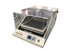 四、结构说明 ①、箱体外壳由薄钢板制成,箱体内有供放置试品的工作室,工作室内有试品搁板,试品可置于其上进行干燥,如遇试品较大,可抽去搁板。工作室与箱体外壳间有相当厚度的保温层,以硅棉或珍珠岩作保温材料,箱门中间有玻璃观察窗,以供观察工作室内情况。 ②、干燥箱内室材料不锈钢。 ③、干燥箱电热器装于箱体内工作室顶部。