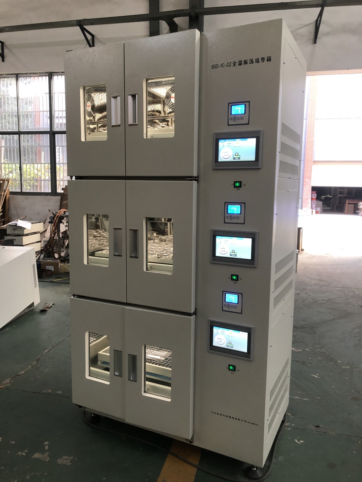 产品特点: 该摇床为3层组合而成,各自有独立的恒温空间和独立的振荡频率,故为了节省实验室的占地空间而叠加而成。外壳采用冷轧钢板制成,静电喷塑,内胆采用优质镜面不锈钢制作,内胆与外壳之间采用聚氨酯保温。工作室内装有强对流空气循环。采用微电脑数字PID控温超温报警。振荡频率由微电脑数字控制,具有缓起动功能。