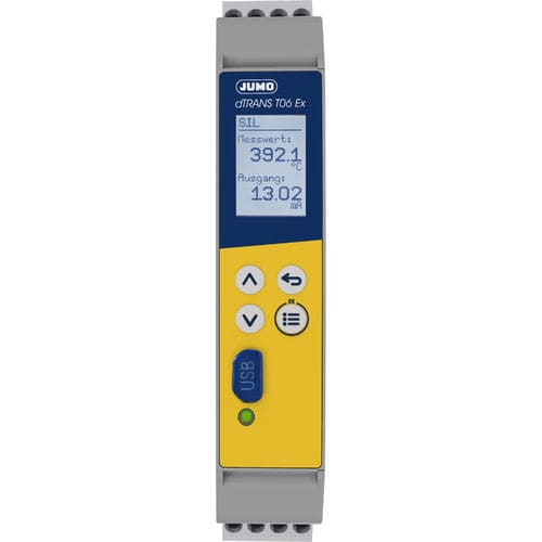 JUMO dTRANS T06 Ex –导轨安装符合 SIL 和Ex 认证多功能四线制变送器(707075) Features • 通用测量输入支持多种传感器和标准信号 • 符合DIN EN 61508标准SIL 2/SIL 3 和 ISO 13849标准PL c/d • ATEX 和 IECEx 认证 • 客户自定义线性 • 通过按键或通过设置软件使用USB接口直观地操作和组态 • RS485 通信接口 (可选项) • 集成附加功能,例如小/大值指示、操作小时计数和输出仿真 • LCD屏可显示接线图 Applications • 过程工业 • 工业炉制造和热工 • 设备制造和机械工程 • 食品工业 • 医药 • 冷冻设备 • 加热器和空调 • 塑料工业 • 可再生能源 • 水和废水处理 Description JUMO dTRANS T06 Ex 变送器, type 707075,依据 DIN EN 61508 SIL 2 为导轨安装而设计。其支持2线、3线或4线制RTD温度探头或热电偶温度信号。测量输入也可连接:电阻器(电阻变送器)和2、3、或4线制电位器, -100 mV - +1100 mV 电压信号, 0 - 20 mA 和 4 - 20 mA 电流信号及0-10V电压信号。输出信号与本质安全的传感器电路(相关电路)电气隔离。可对测量输入偏差进行线性修正(线性、温度线性、或客户自定义线性)。输出支持 0(4) - 20 mA 或0(2) 10 V 信号类型。可通过RS485接口扩展 JUMO dTRANS T06 Ex, type 707075功能。可通过图形显示测量值。通过两色LED(红,绿)灯指示工作状态。绿灯亮表明工作正常,红灯亮时表明处于故障状态。可使用计算机设置软件对传感器类型、测量范围、线性、输出信号、限值等参数进行组态。因此,设备科通过 micro-USB 端口和相应的USB电缆连接到计算机。另外,也可通过4个按键进行组态。变送器有22.5mm的宽度并设计为安装于符合 EN 60715 标准的 35 mm x 7.5 mm 的DIN导轨上。 螺丝端子可连接0.2 to 2.5 mm²的导线。设备符合 DIN EN 61508 SIL 2 需求。硬件和软件系统性能(SC3)符合安全性能等级(SIL3)要求。根据应用结构, 也可达到SIL 2 或 PL c , HFT=0 (单设备) and SIL3 或 PL d , HFT=1 (2 设备). |