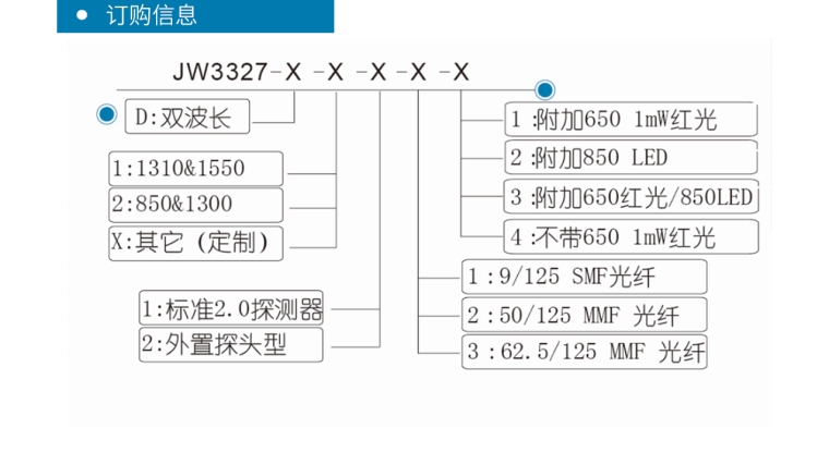 产品特点 1) 内置高稳定光源 2) 大尺寸彩屏显示 3) 可通过菜单设置测试阈值 4) 双波长IL/RL同时测试 5) 支持多种光纤接口转换 6) 增加850波长,可检测多模跳线插损 7) 内置红光功能,便于找到跳线另一端提升测试速度 产品特点 JW3327插损回损测试仪是集合自身多年光纤无源器件和光通信检测仪表生产和测试经验,充分借鉴国内外仪表的优点和国内客户的需求,精心研制开发出来的一款精密光检测仪表。 它广泛应用于光纤光缆、光无源器件和光纤通信系统的插损和回损测试,是广大生产厂商、科研机构和运营商用于生产检测、研究开发和工程施工维护基本的测试仪器。